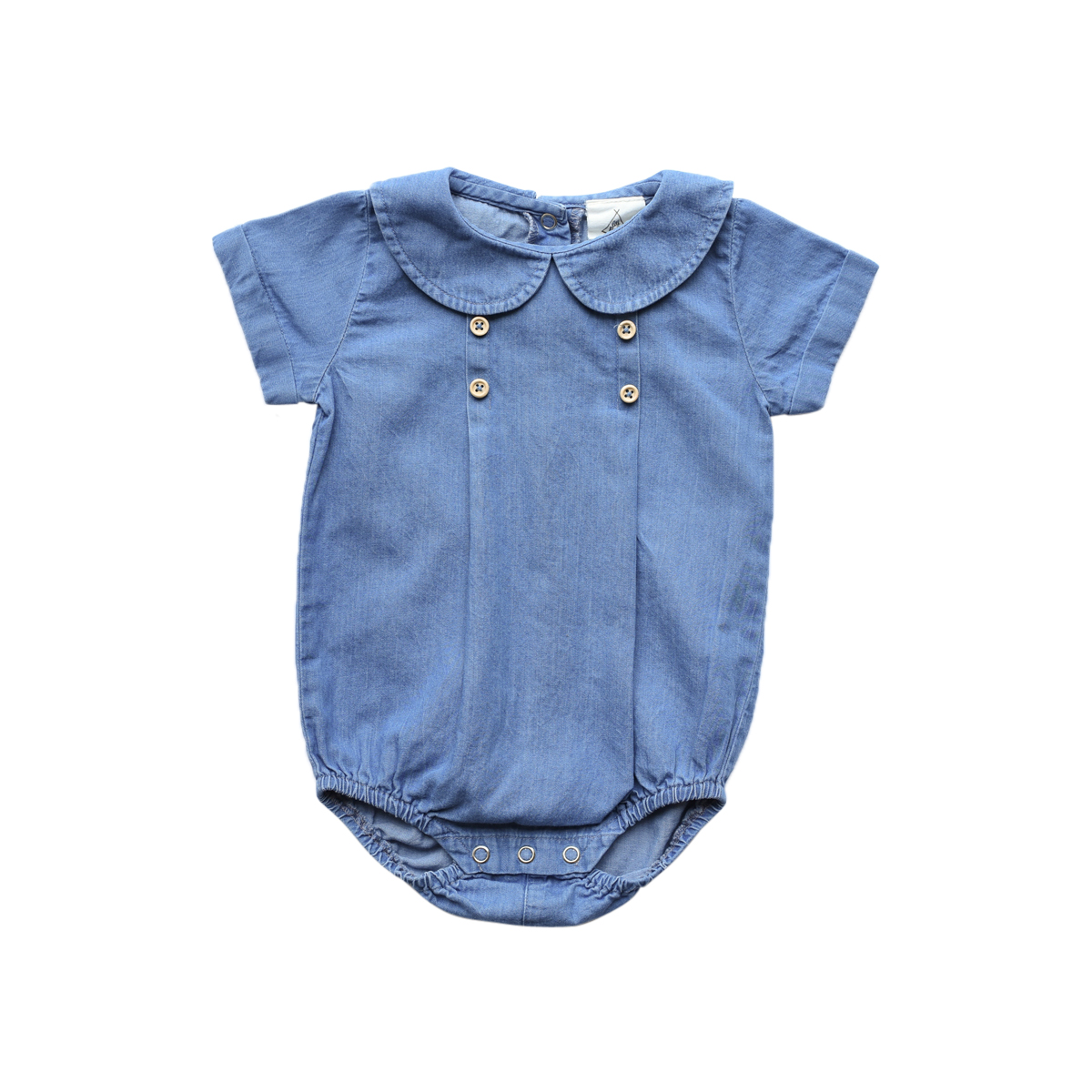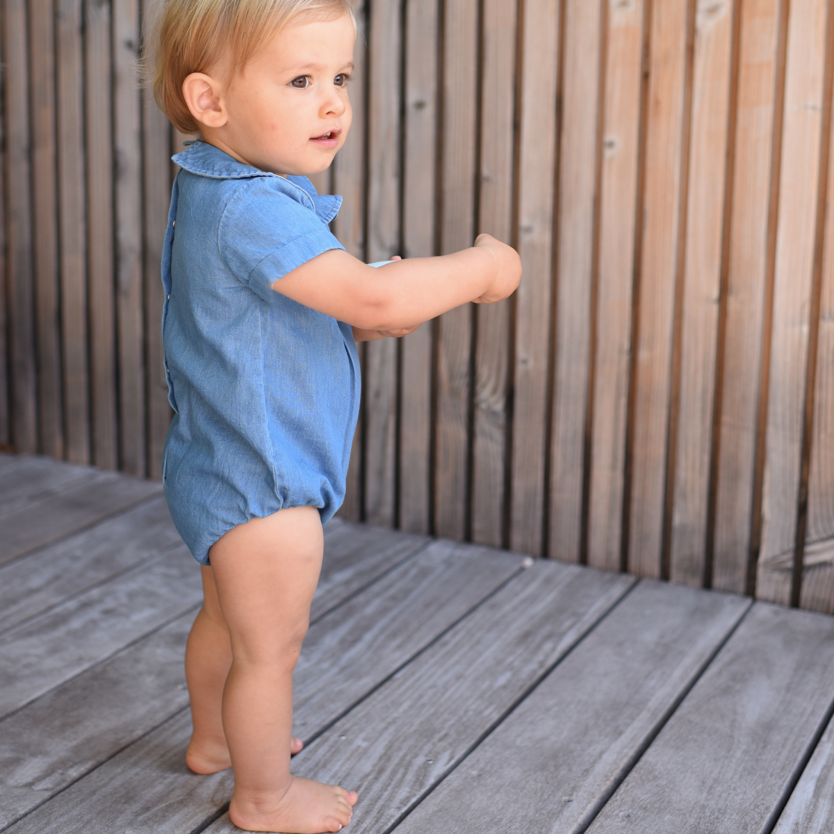 Optez pour cette barboteuse au style intemporel et mixte, adorable avec son petit col claudine, ses plis délicats sur la poitrine et ses 4 charmants boutons en bois. Appréciez le confort de ses cuisses élastiquées qui ajoutent une touche bloomer. Confectionnée dans un joli denim clair et léger, elle est parfaite pour l’été et est également disponible dans une version à rayures bronze.