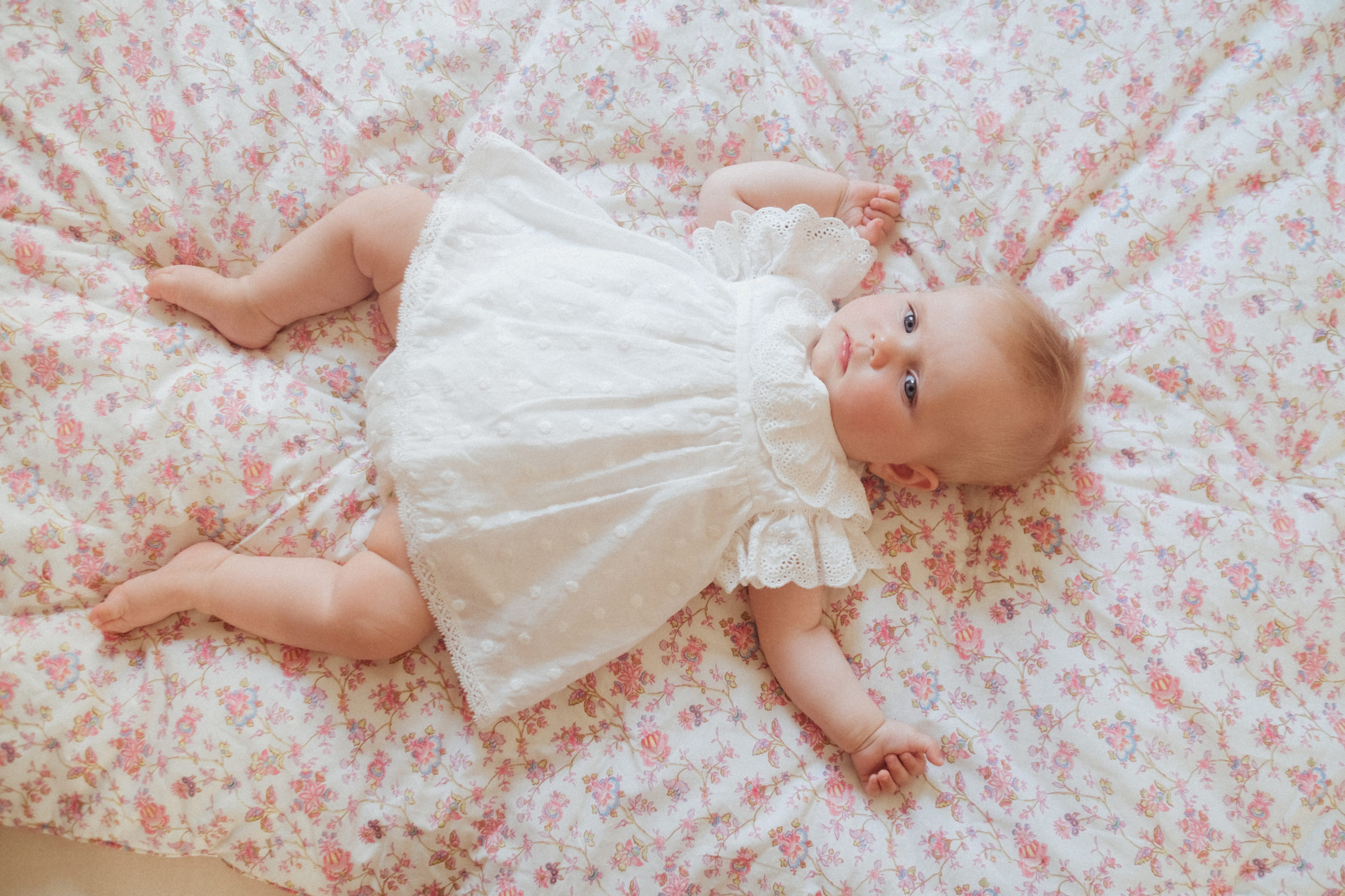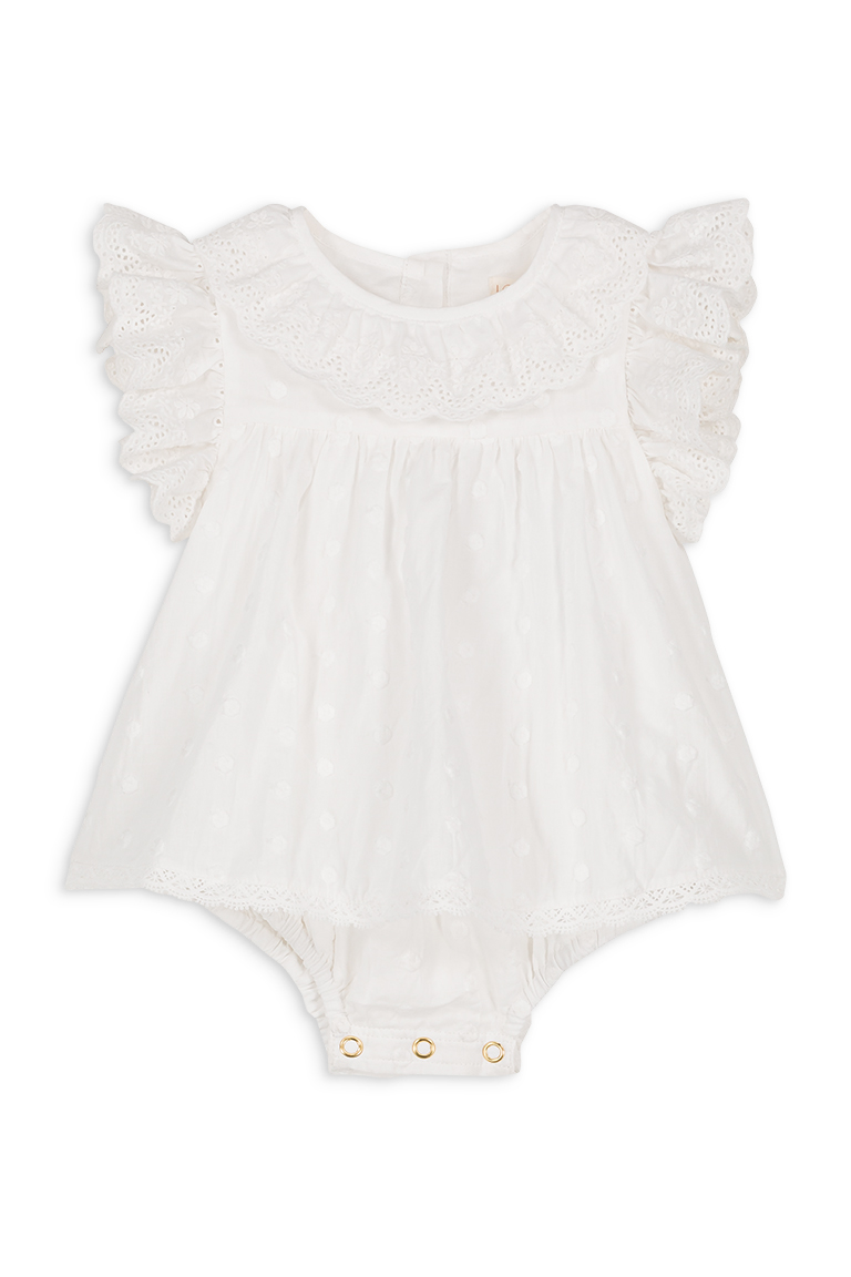 Cette adorable barboteuse d’inspiration rétro est idéale pour les jours d’été comme de fête, avec son blanc immaculé rappelant la pureté des pétales de pâquerettes du jardin. Son délicat col Pierrot et son ample volant ajoutent une touche de charme, invitant les plus petites à esquisser quelques pas de danse dès leur plus jeune âge.