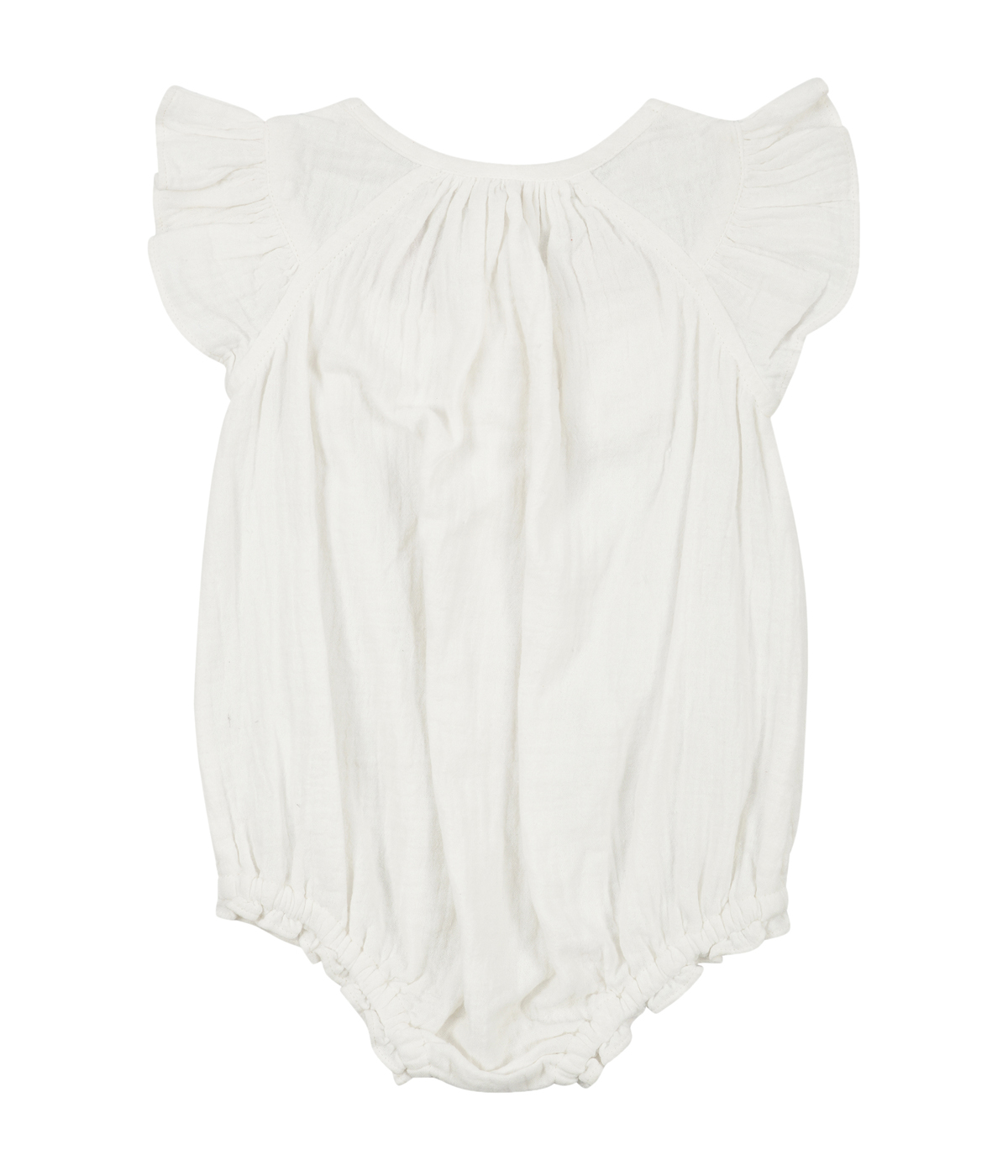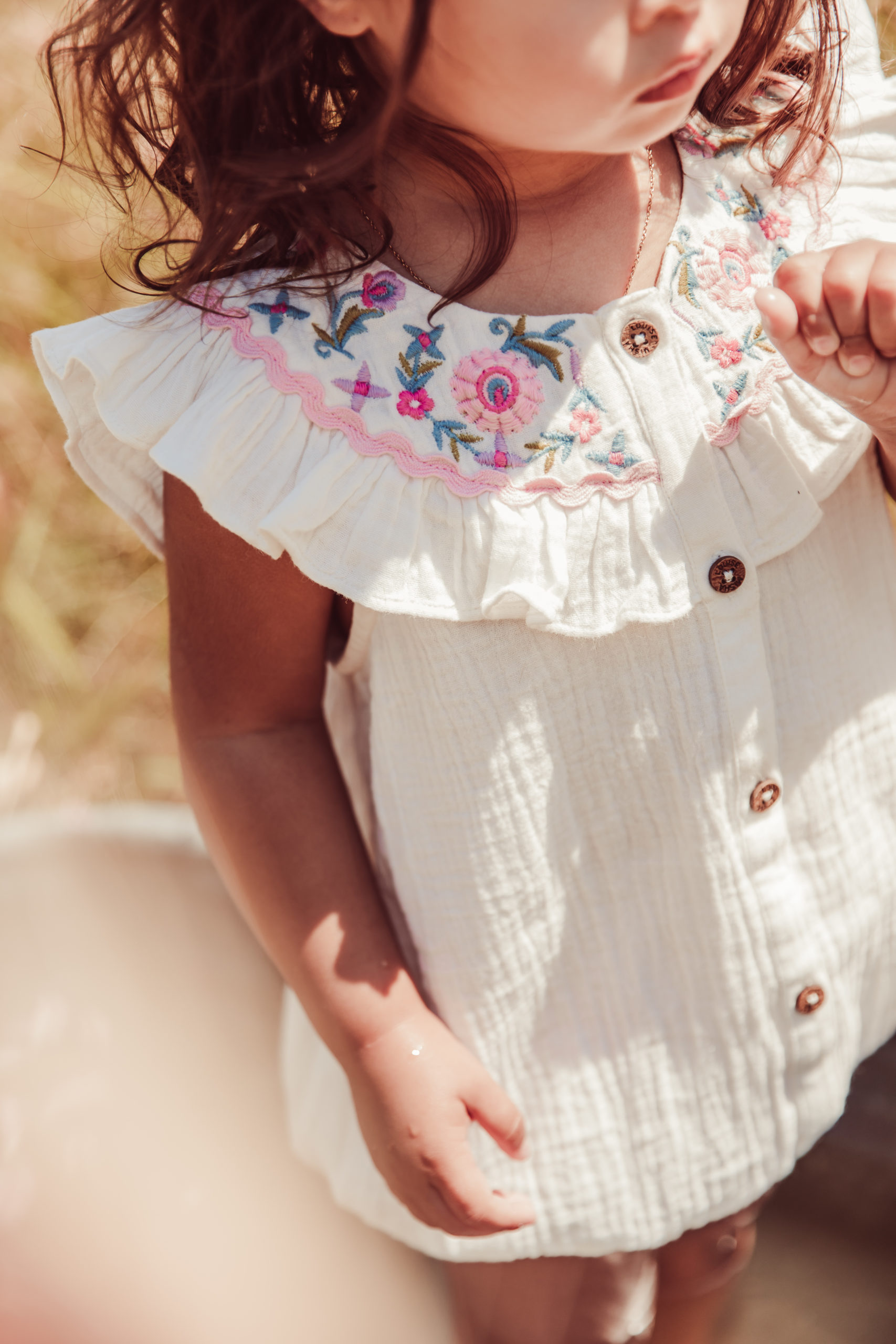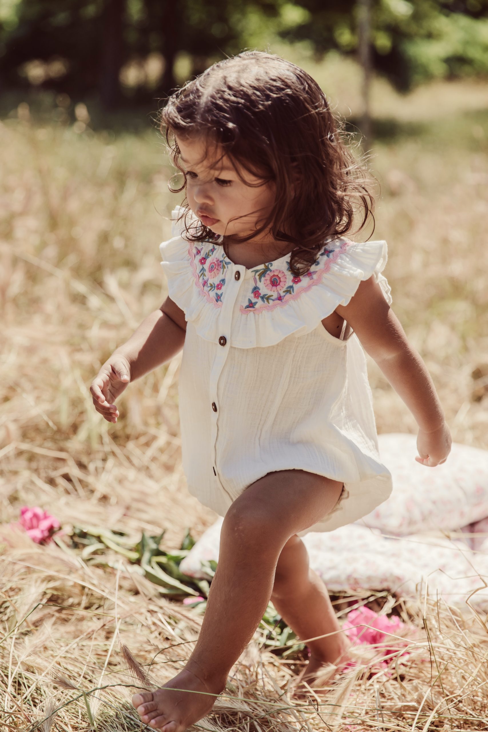 Cette adorable barboteuse évoque délicieusement les après-midis passés à cueillir des fleurs ! Agrémentée d’un généreux volant sous le plastron et de broderies délicates, elle apporte une touche de coquetterie et d’élégance à vos petites filles.