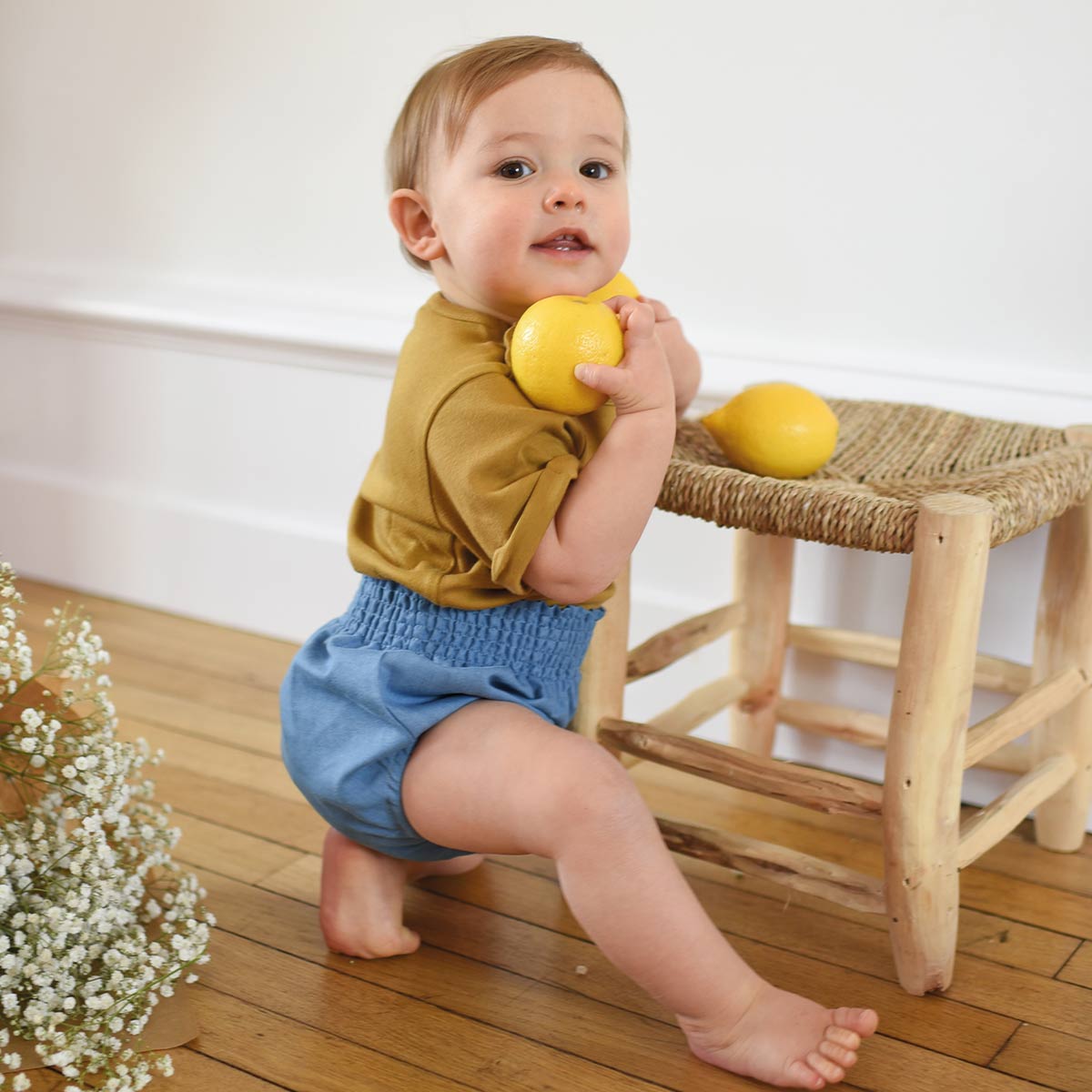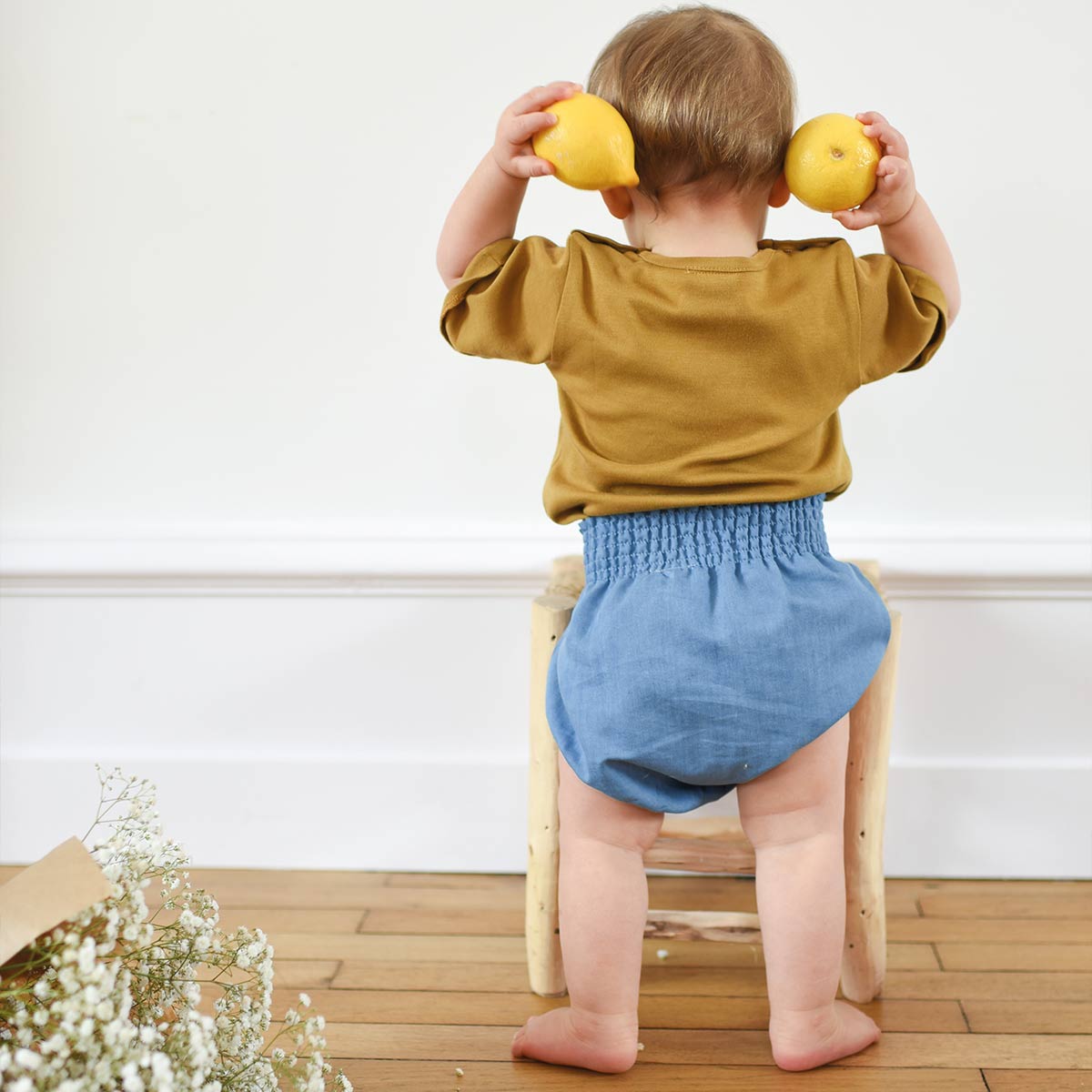 Ce bloomer demeure un modèle emblématique. Pour cet été, nous le présentons dans un ravissant coton denim, d’une légèreté remarquable. Il vous séduira par sa coupe bouffante, sa taille smockée et ses fronces aux cuisses, lui conférant un charme rétro et mixte très adorable. Il s’associera parfaitement une de jolies blouses ou chemises, ou tout simplement porté sur un body.