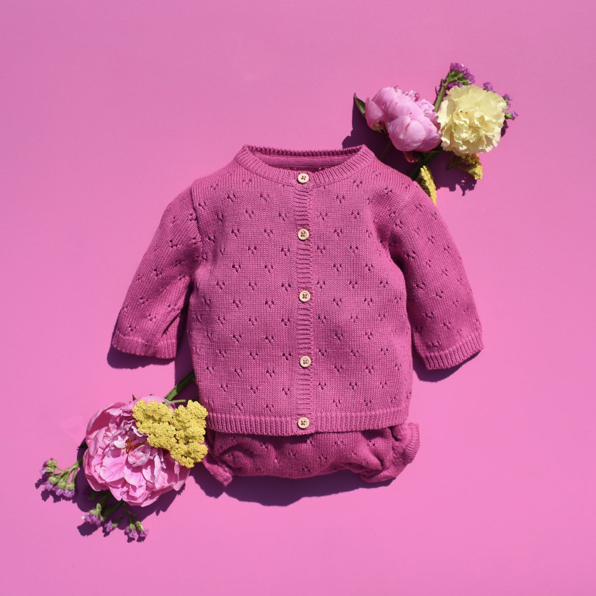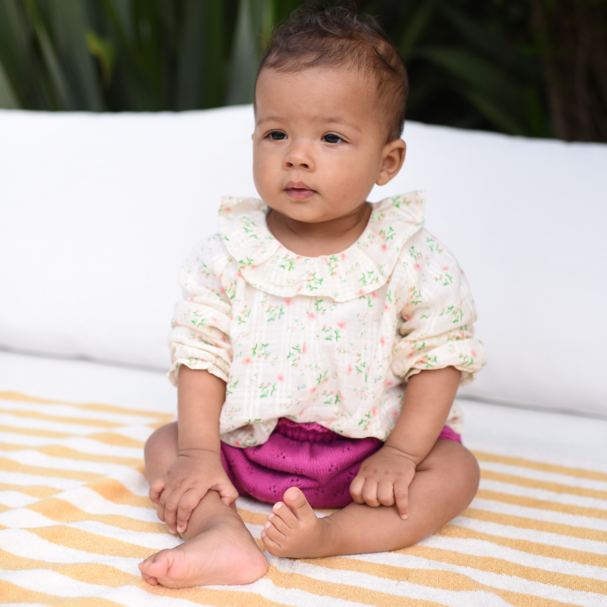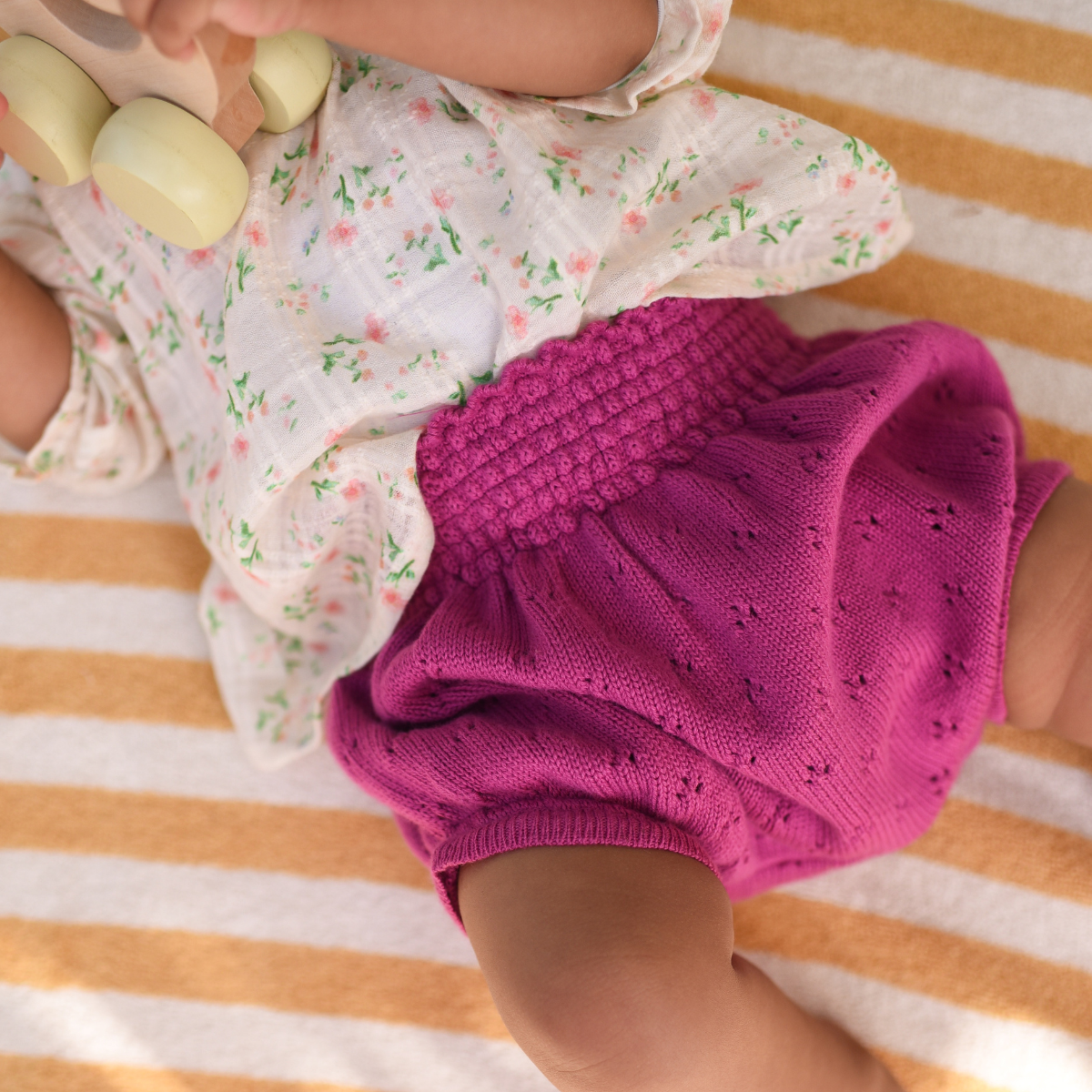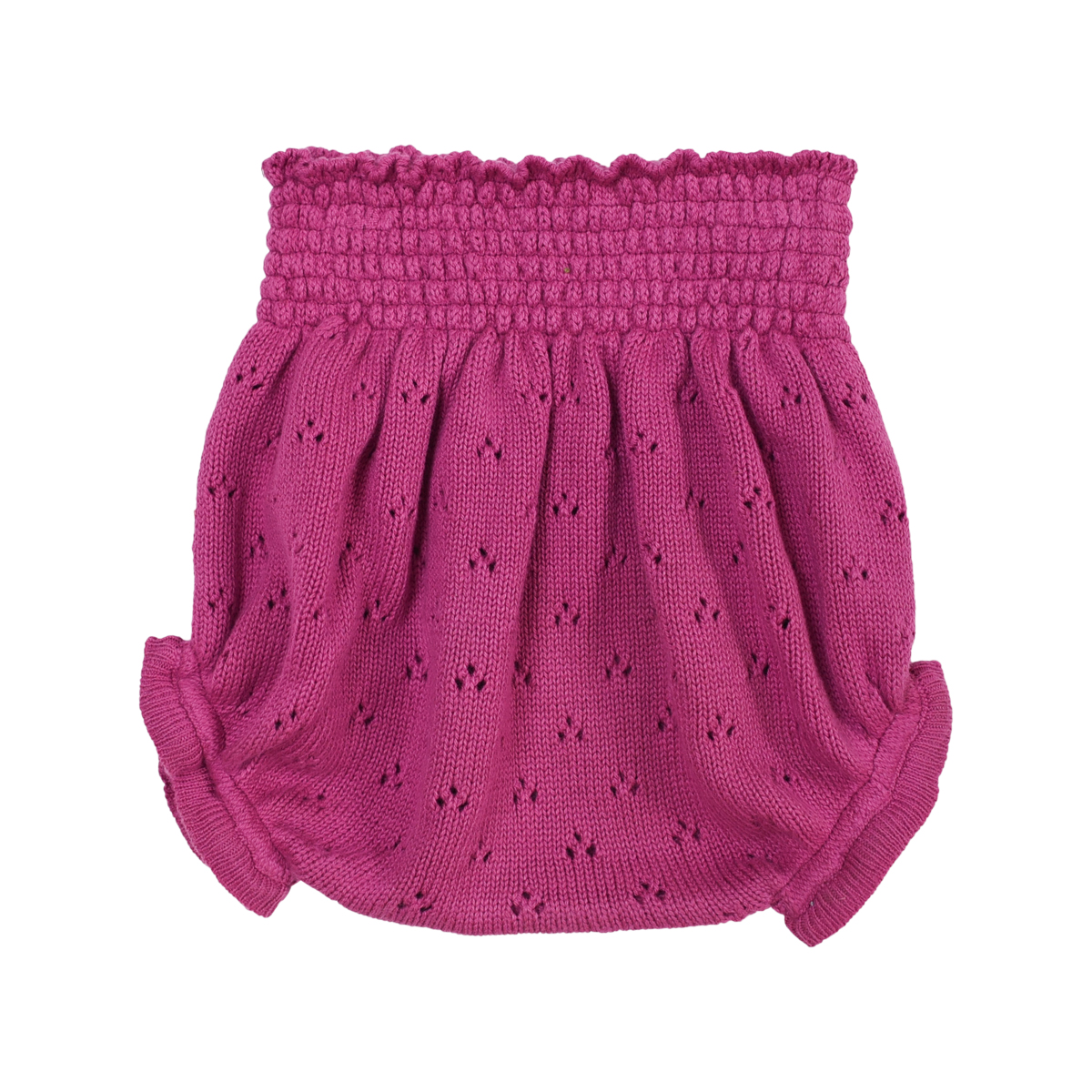 Cet incontournable bloomer se distingue par ses fronces à la taille et ses cuisses élastiquées, créant un effet bouffant charmant. Dans sa version en tricot ajouré couleur orchidée, il offre un look à la fois adorable et délicat.
