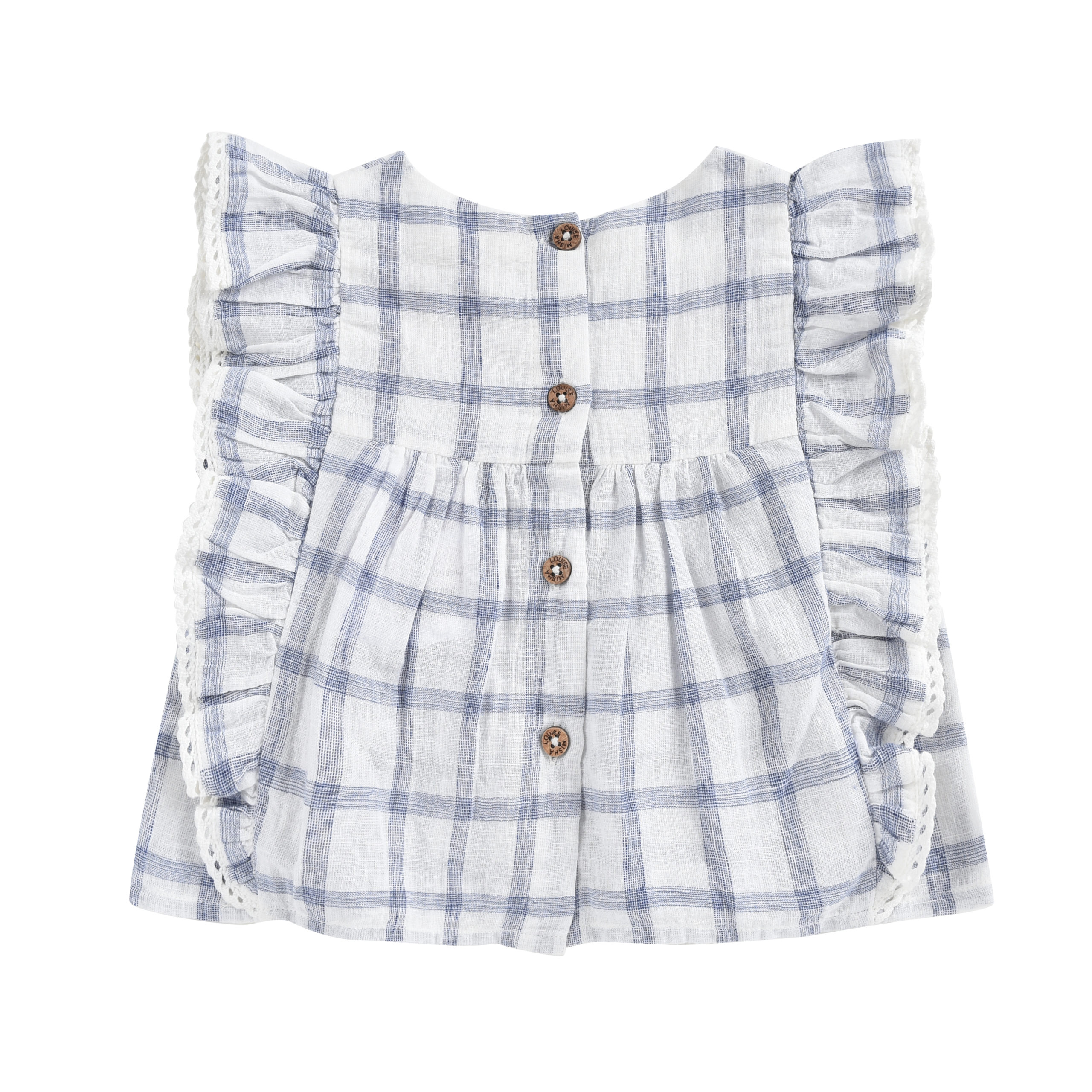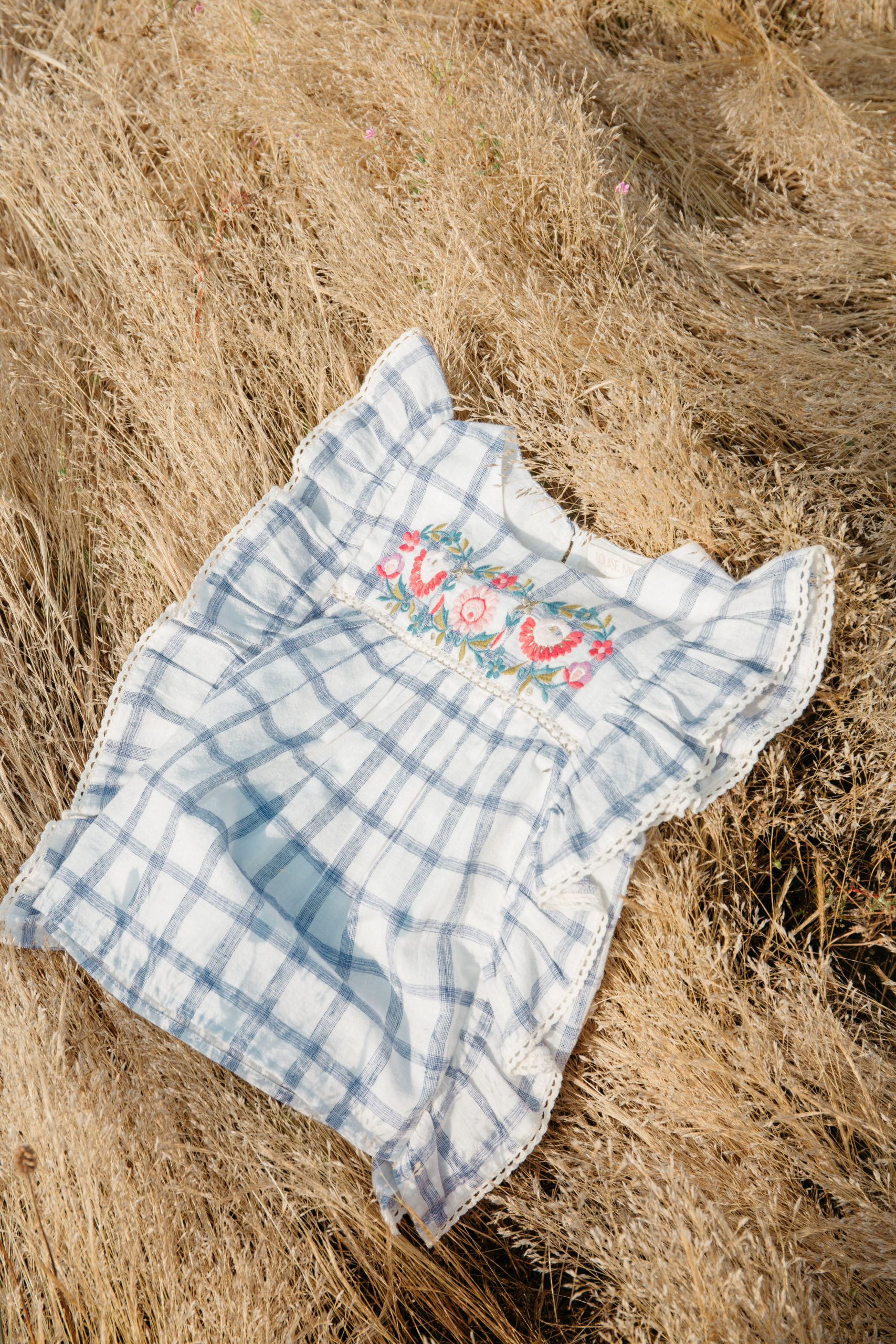 La blouse Mala évoquant à la fois le rustique et le précieux avec ses broderies fleuries et ses motifs à carreaux. Associée avec audace à des shorts ou des jupes ornés d’imprimés floraux, elle crée une harmonie joyeuse où carreaux et fleurs s’entrelacent dans un duo irrésistible, toujours plein de vie.