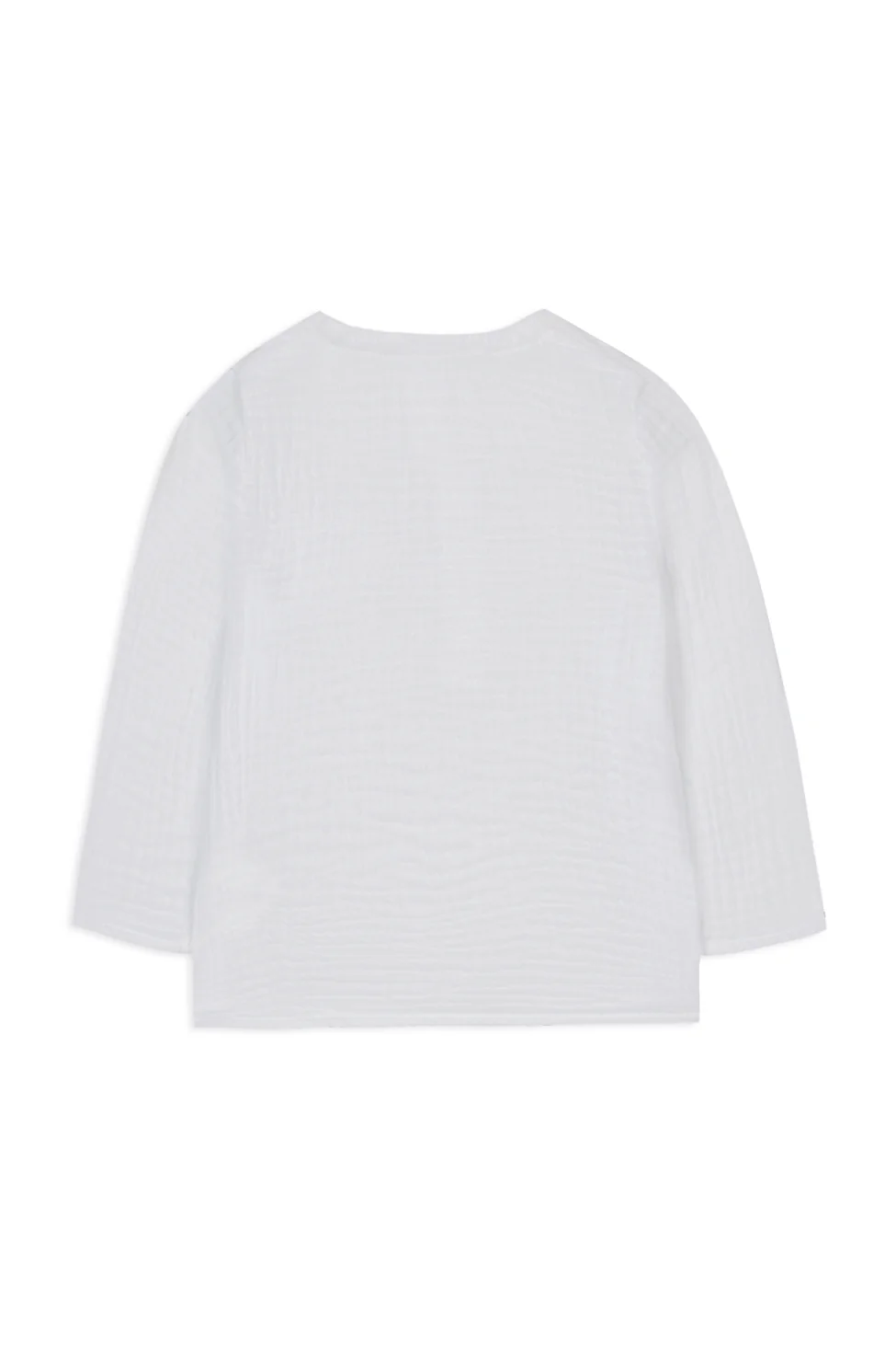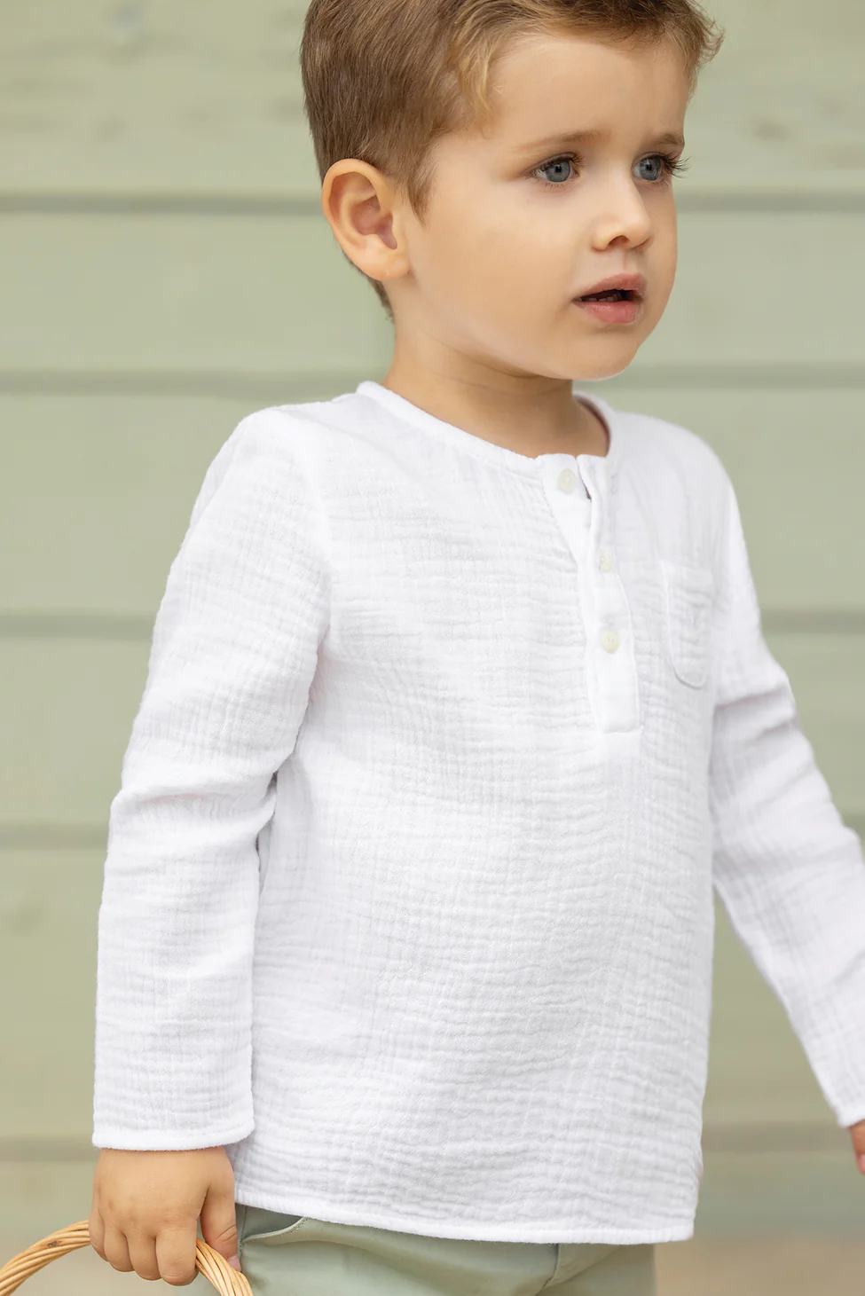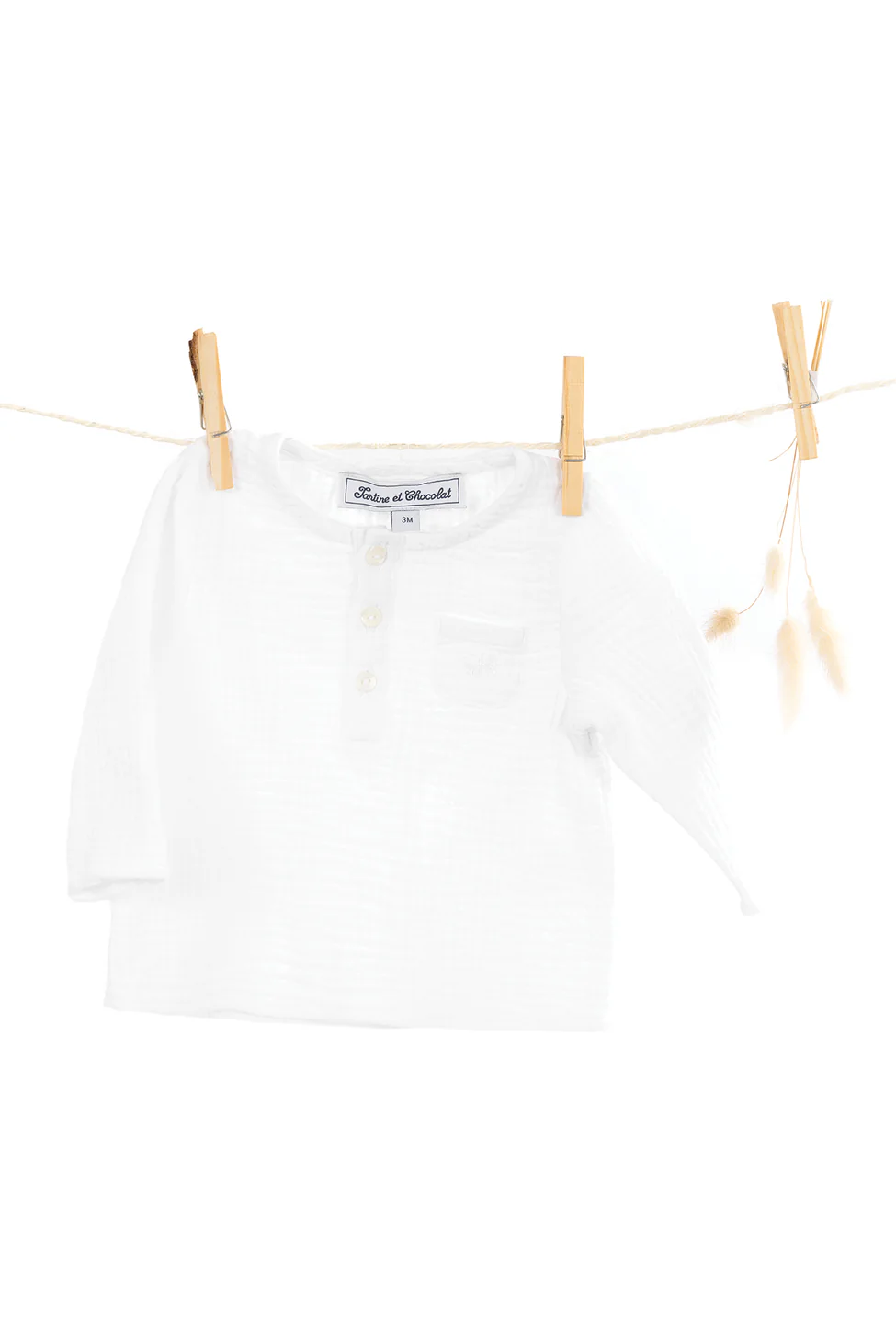 Cette ravissante chemise blanche au col mao, confectionnée en gaze de coton, est un choix parfait pour cette saison. Fabriquée à 100% en coton, elle offre à bébé un confort optimal. Sa coupe apporte une élégance supplémentaire à la tenue de bébé. Associez-la à un short assorti de la même collection pour un look complet et harmonieux.