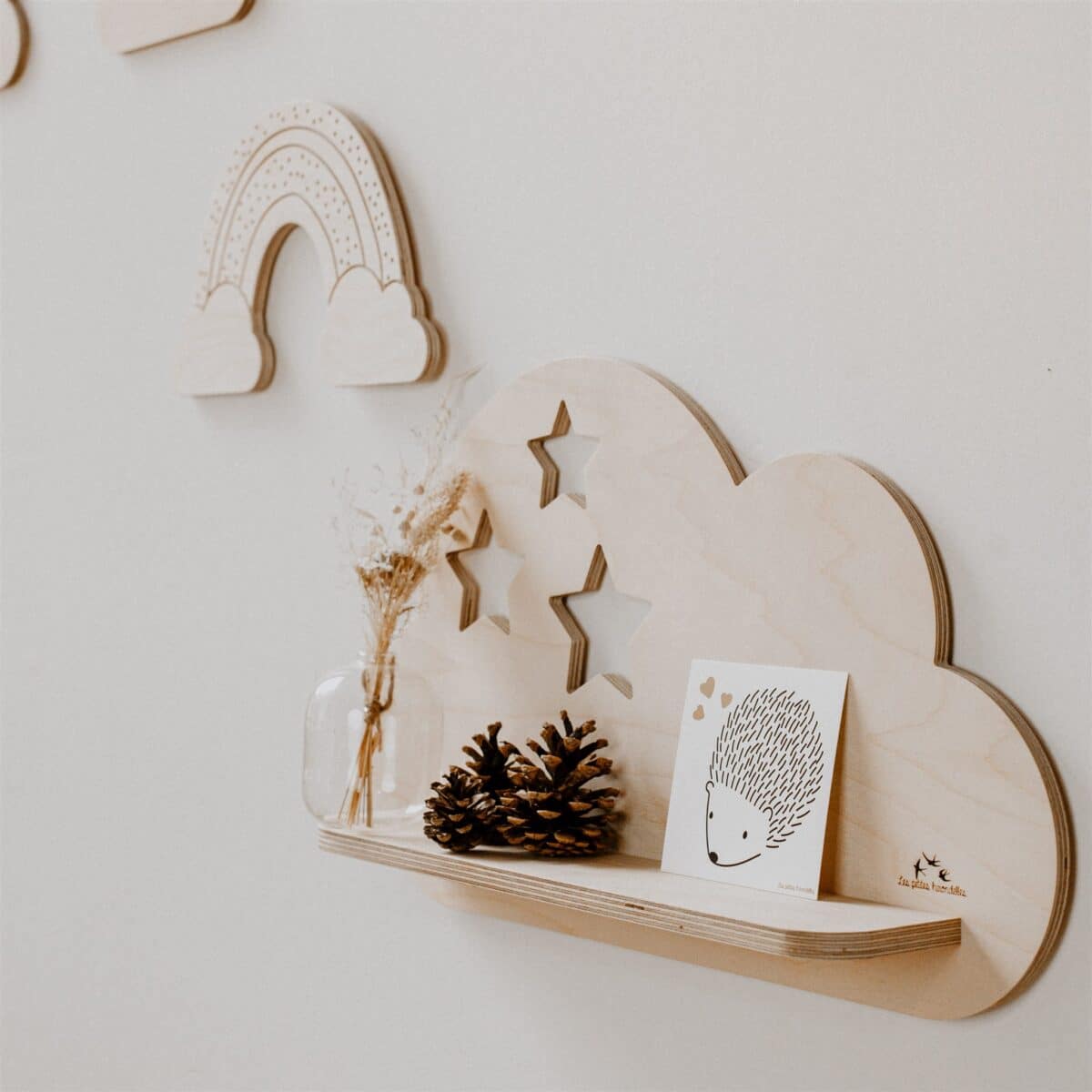 Etagère en bois (38,5 x 48,5cm). En contreplaqué bouleau 9mm issu de forêts durablement gérées. Bois brut, non verni. Dessiné et fabriqué en France. Le support et sa tablette sont à assembler. L’étagère pourra être fixée au mur grâce à une notice et aux vis et chevilles fournies. Elle est emballée avec soin dans une jolie boite en carton cannelé 100% recyclé et recyclable. Chaque pièce est unique et peut présenter des variations légères en couleur et aspect du bois. Cet article n’est pas un jouet.