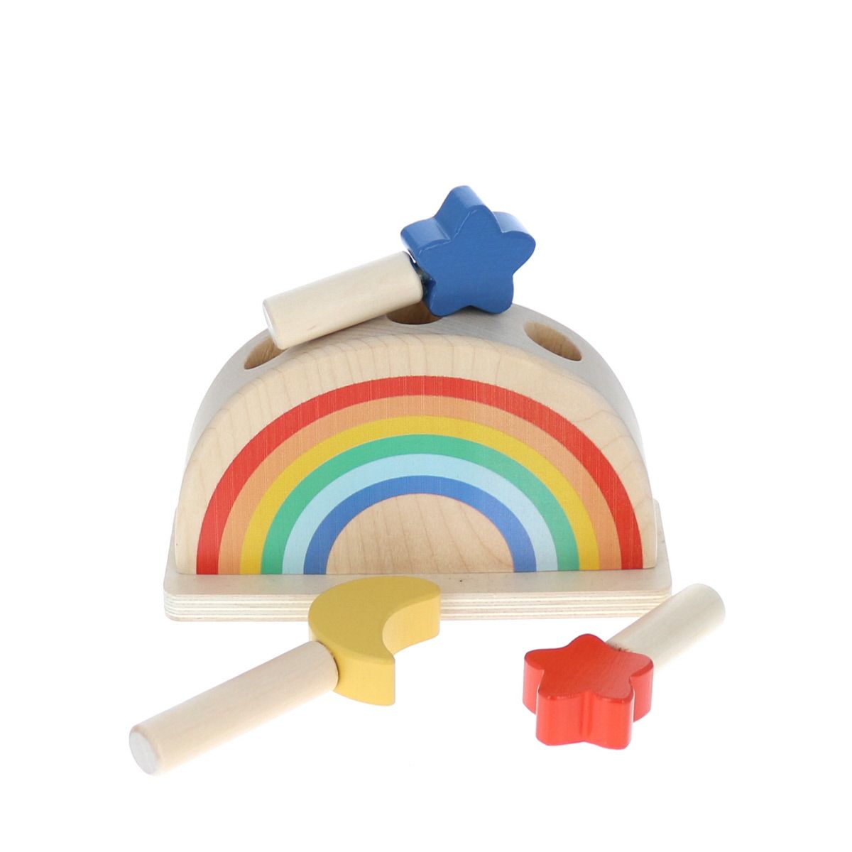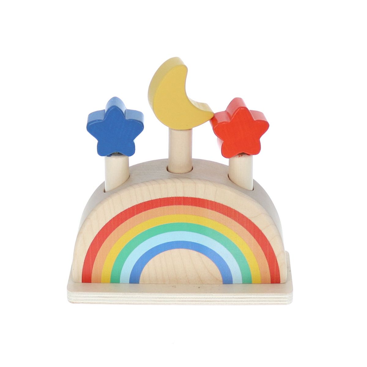 Ce jeu en bois Pop up arc-en-ciel représente un socle solide en bois coloré d’un arc-en-ciel. Avec ses 3 trous sur le dessus, l’enfant doit y placer les 3 tiges en bois décorées d’une forme de lune ou d’étoile. Un jeu d’éveil pour travailler la dextérité, motricité fine et l’apprentissage de la logique des formes et couleurs.