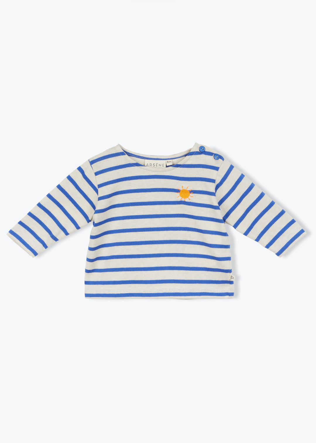 Une broderie fantaisie ajoute une touche d’originalité et de fantaisie à cette marinière, tandis que l’ouverture boutonnée à l’épaule facilite le passage de la tête de bébé lors de l’habillage.