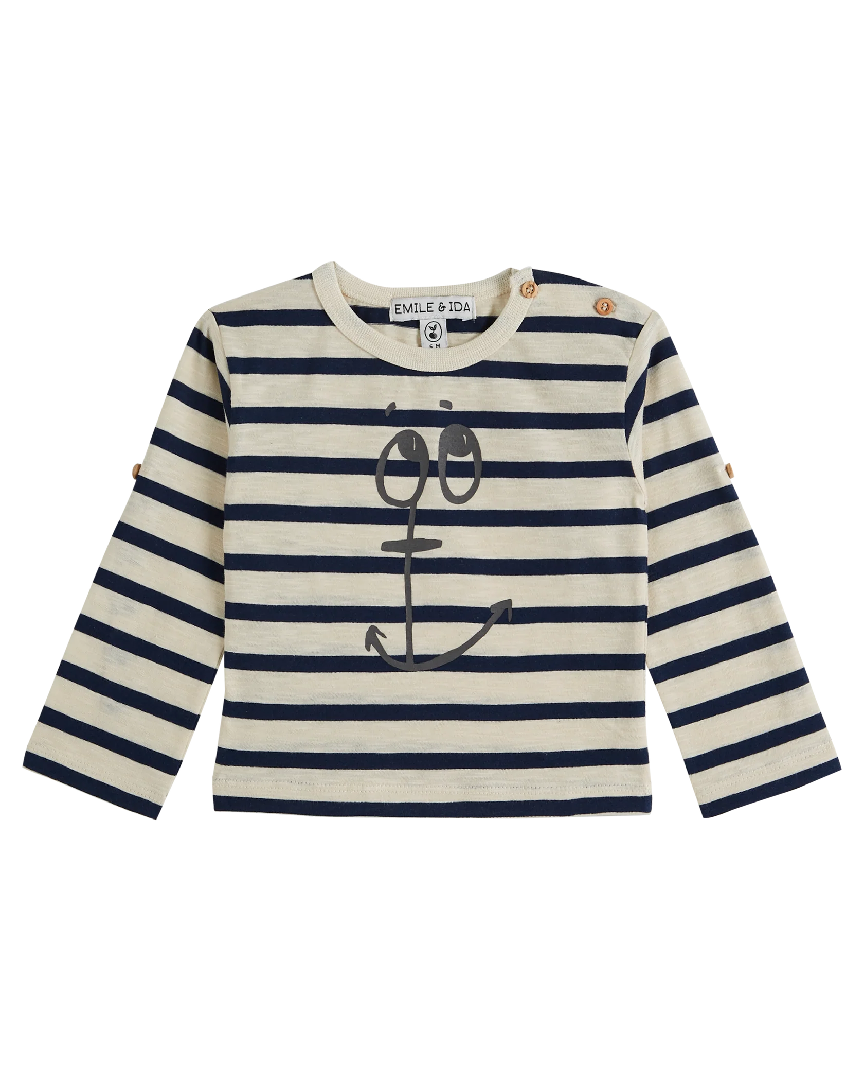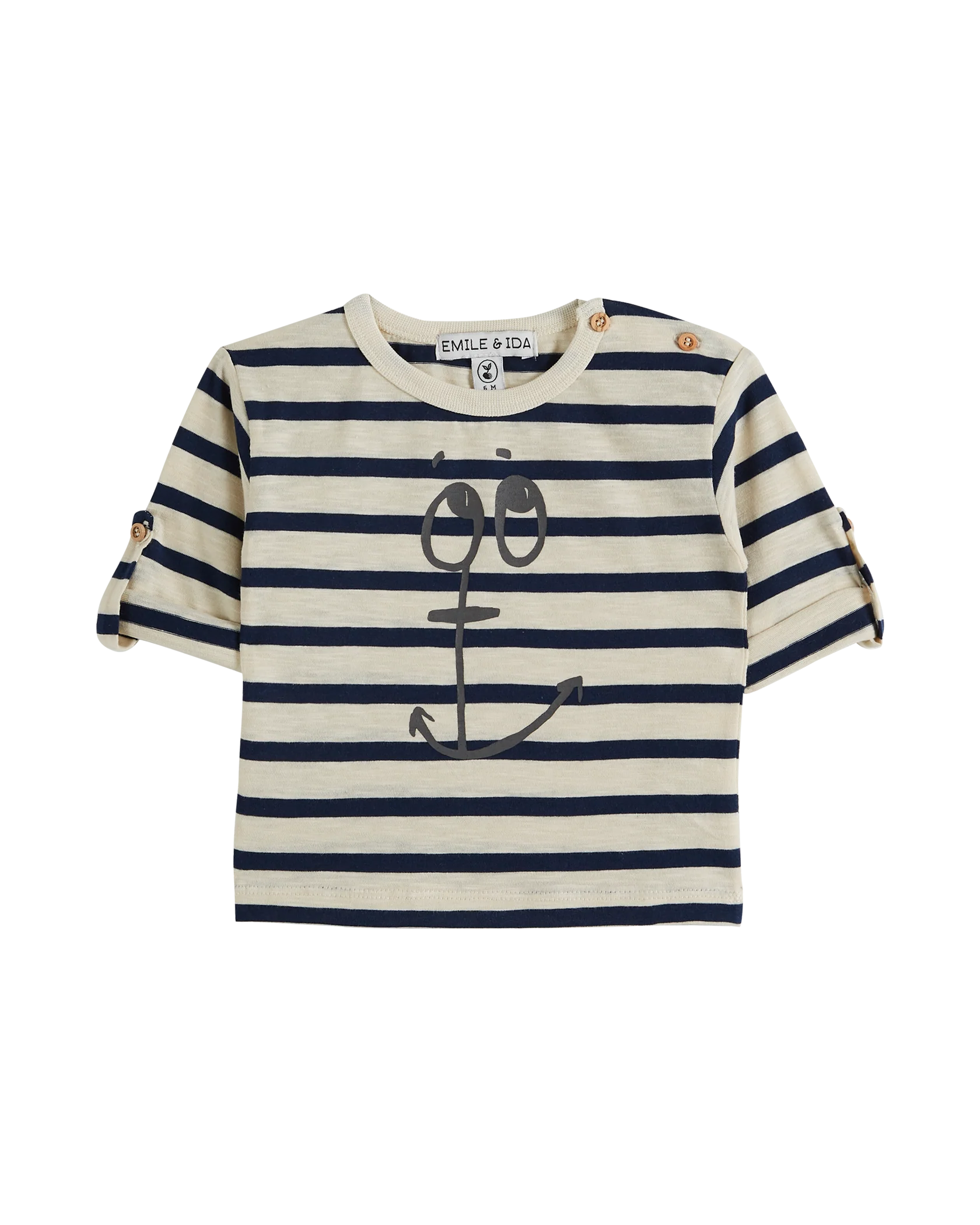 Marinière à manches longues confectionnée dans un jersey de coton biologique, rayé de lignes bleues sur fond écru, orné d’une ancre anthropomorphe imprimée. Sa matière toute douce offre un confort optimal, tandis que son encolure ras du cou est finement bordée d’un bord-côte écru. Les manches longues peuvent se transformer en manches courtes grâce aux pattes de relevage fixées à l’intérieur, offrant ainsi une polyvalence adaptée aux saisons. Son imprimé respire la joie et la bonne humeur, faisant de ce tee-shirt un incontournable pour rester confortable quel que soit le temps.