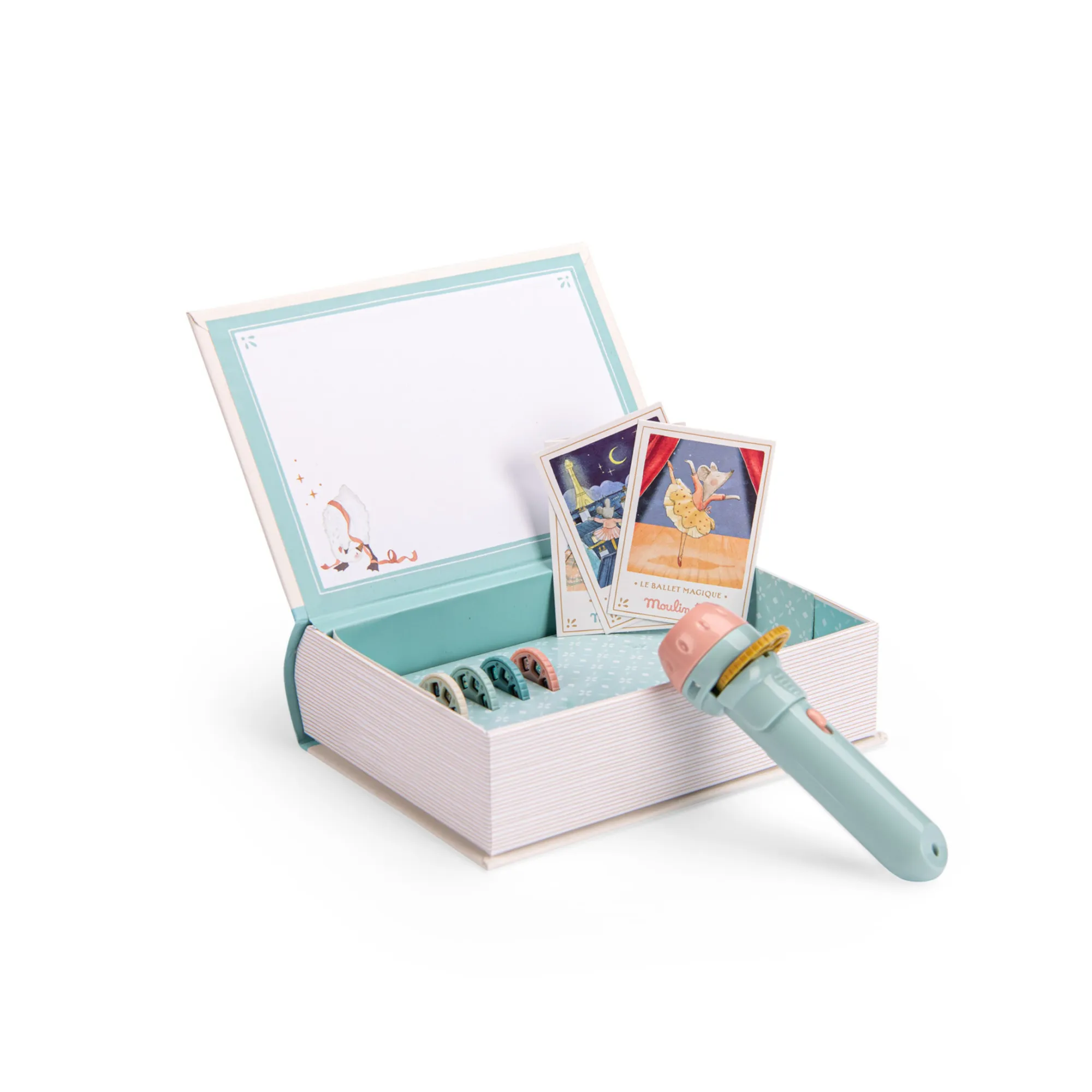 Ravissant coffret aimanté, conçu comme un livre et contenant : une lampe à projeter avec 5 histoires de contes joliment illustrées de La Petite Ecole de Danse et de précieux cartons d’invitation aux spectacles, en forme de mini cartes postales.