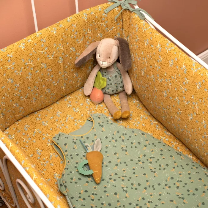 Avec sa frimousse à moustaches et ses grandes oreilles toutes douces, cet adorable lapin à la salopette sauge ne demande qu’à faire des câlins ! Compagnon de jeu la journée et doudou protecteur la nuit, il accompagnera bébé.