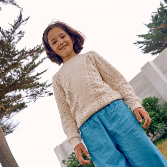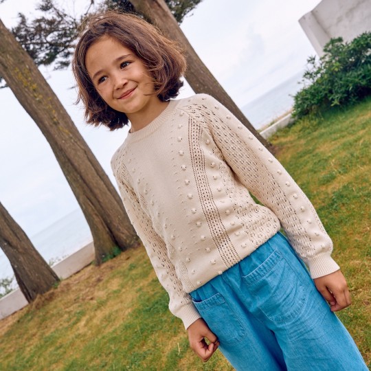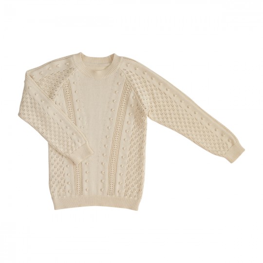 Découvrez un pull en tricot à l’allure résolument tendance, orné d’un travail minutieux aux motifs fantaisie : du point jersey aux détails ajourés, de la maille torsadée au relief subtil… Son coloris écru d’une douceur exquise apporte une touche de fraîcheur indéniable.