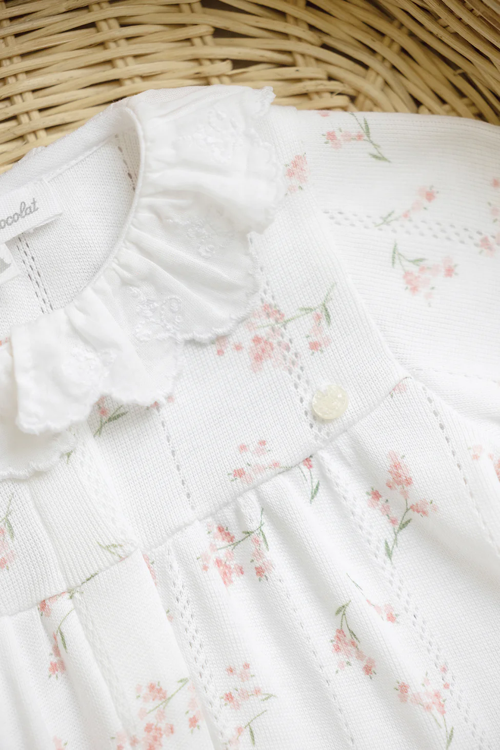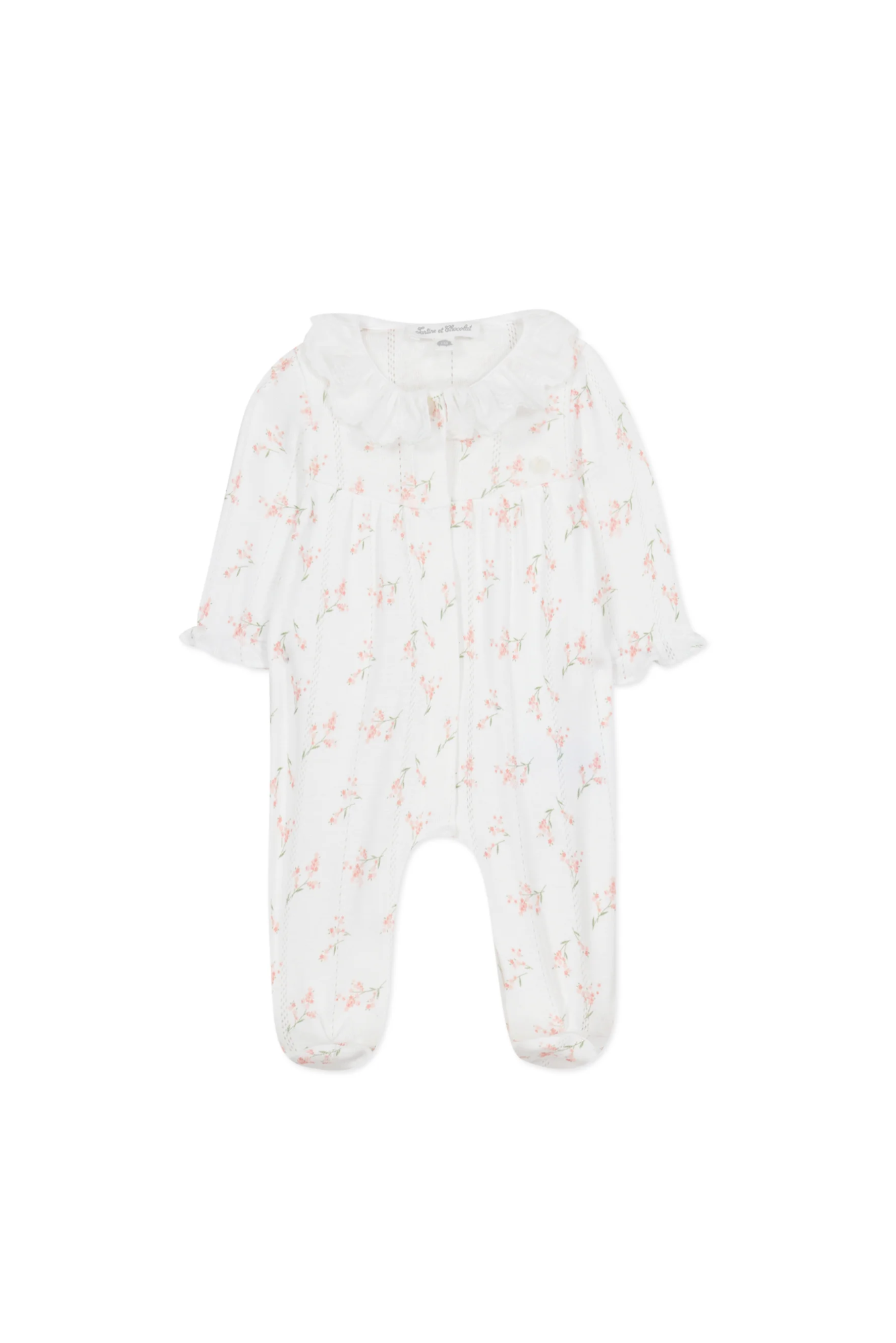 Coup de cœur absolu pour ce charmant pyjama blanc orné d’imprimés fleuris rose pâle, idéal pour habiller bébé en cette saison. Son col volanté brodé ajoute une note d’élégance supplémentaire à cette pièce. Confectionnée en 100% coton, bébé sera enveloppé de douceur tout au long de la journée et de la nuit. Les pressions sur le devant et à l’entre-jambe faciliteront le change.
