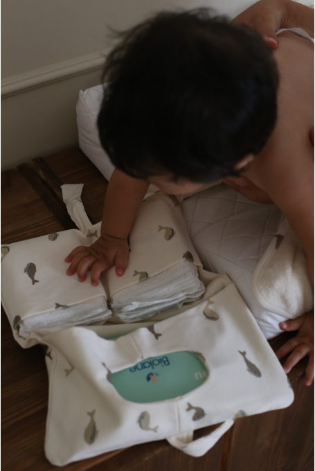 - Pochette pouvant contenir jusqu’à 4 couches + un paquet de lingettes (ou lingettes lavables)