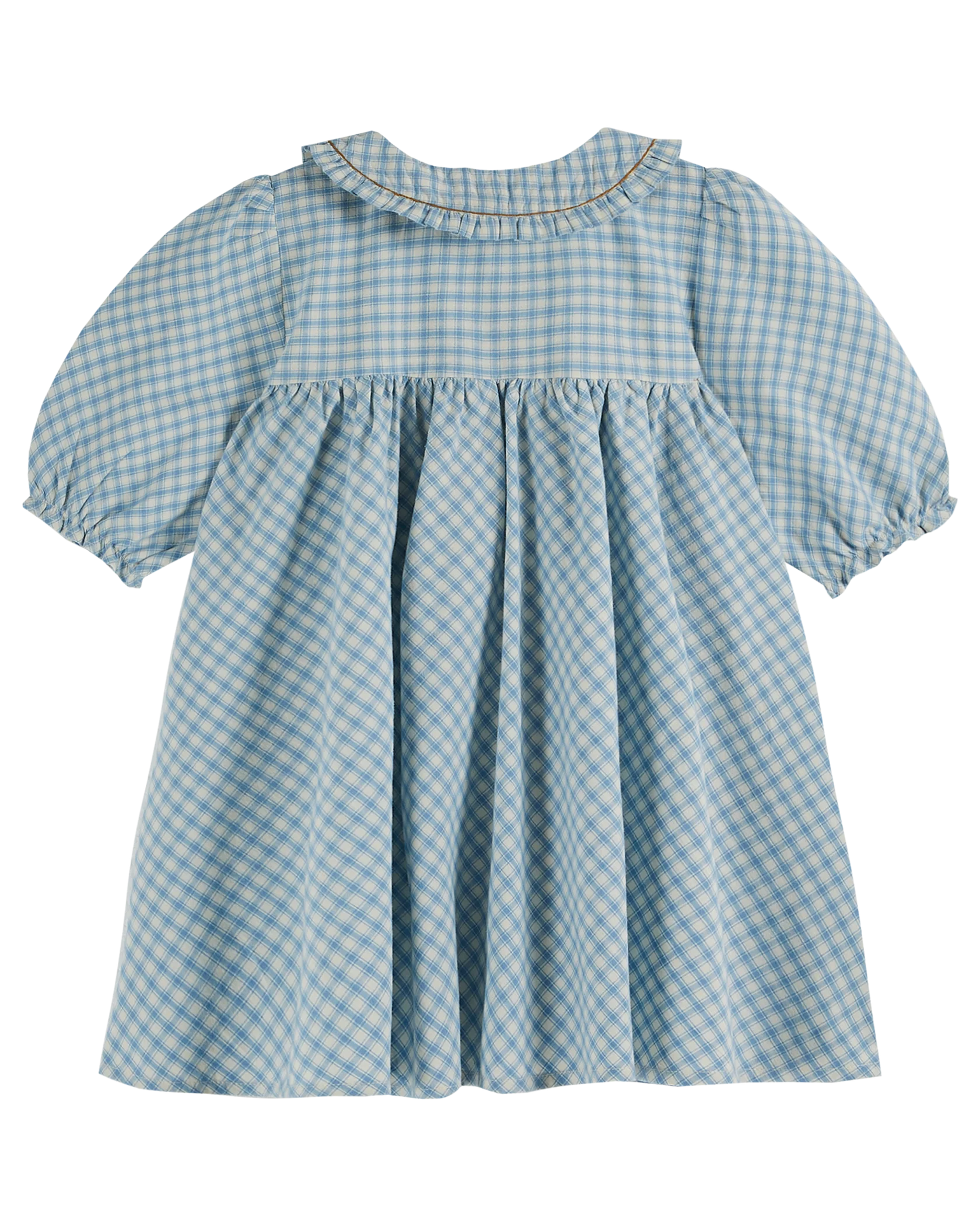 Cette robe courte en coton bleu clair et écru évoque la nostalgie des années 60, de Saint-Tropez et de Brigitte Bardot ! Sa matière douce et sa coupe ample, accentuée par des fronces soutenues par les empiècements devant et dos, offrent un confort absolu. Les manches ballon élastiquées avec un effet volanté dans le bas, les boutons en nacre naturelle sur le devant et le col plat agrémenté d’un petit volant ajoutent une touche charmante. Les détails uniques incluent les fleurs brodées à la main sur les boutons, le galon de croquet délimitant l’empiècement coupé dans le droit fil opposé à la jupe taillée dans le biais. La robe, entièrement doublée et assemblée avec soin en couture anglaise, est polyvalente : elle peut être portée comme une robe courte ou comme une tunique sur un legging.