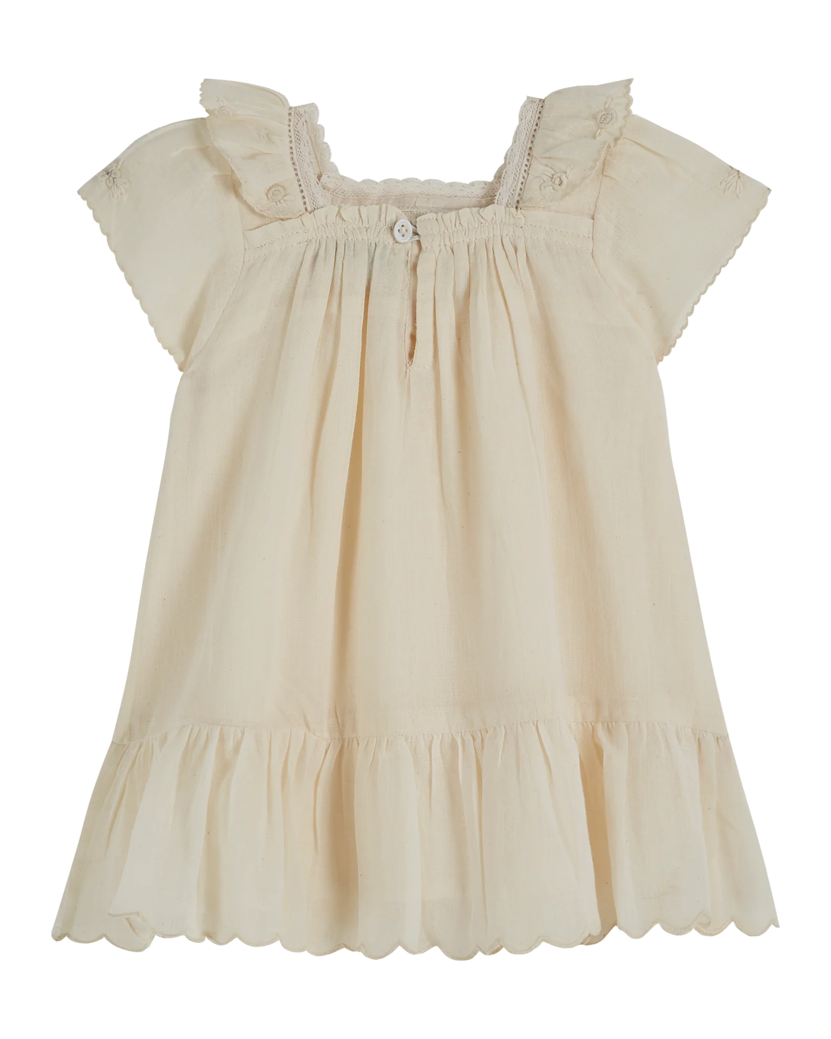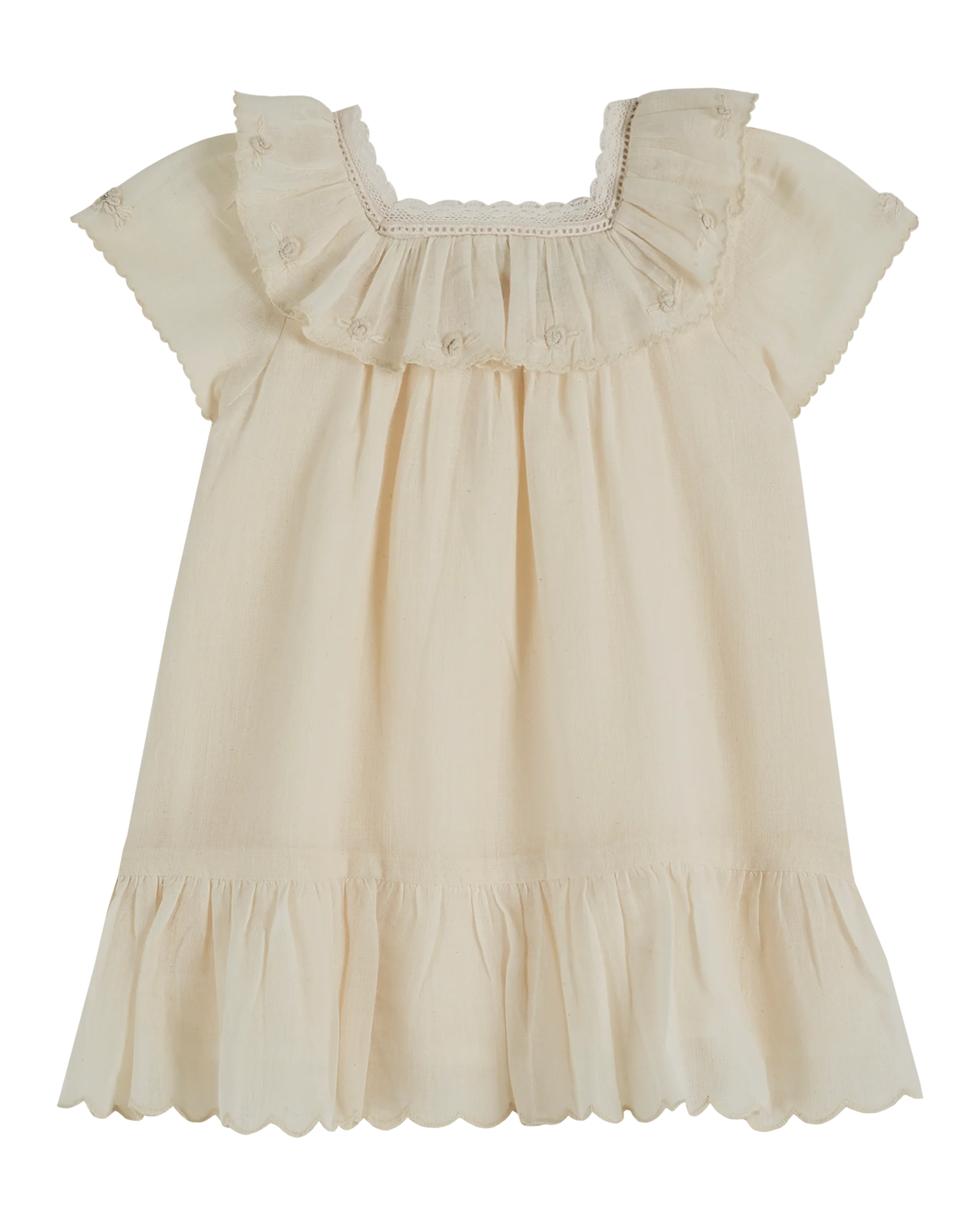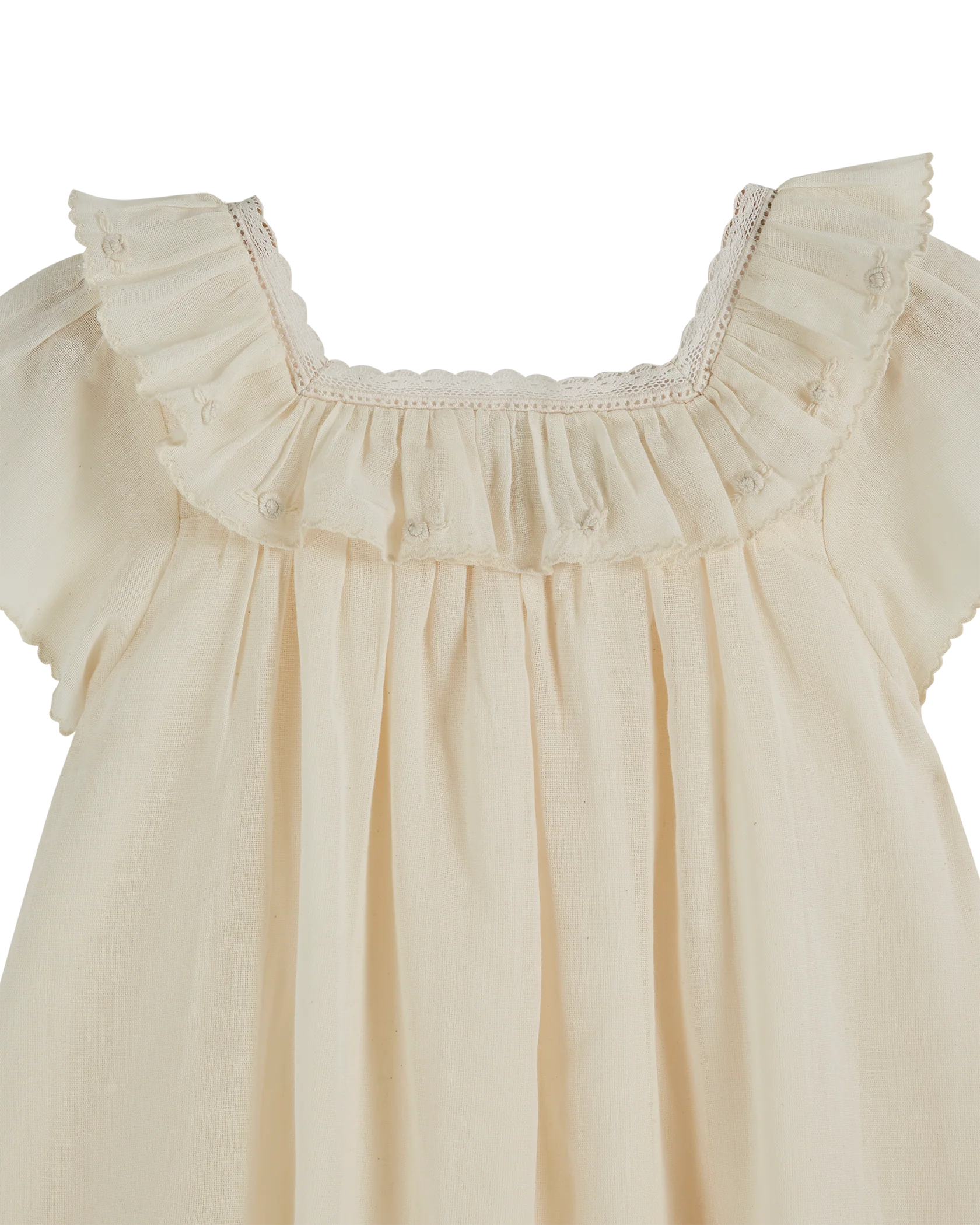 Robe en gaze de coton écrue, délicate et raffinée. Une touche de dentelle fine encadre l’encolure carrée, avec un délicat jour échelle. La collerette autour du cou et le volant au bas de la robe ajoutent une élégance supplémentaire. Les manches et le col sont ornés de fleurs brodées à la main, tandis que des ourlets festonnés au point de bourdon apportent une finition soignée. Entièrement doublée pour contrer la transparence de la matière, cette robe légère et aérienne sera parfaite pour toutes les occasions, des plus petites aux plus grandes.
