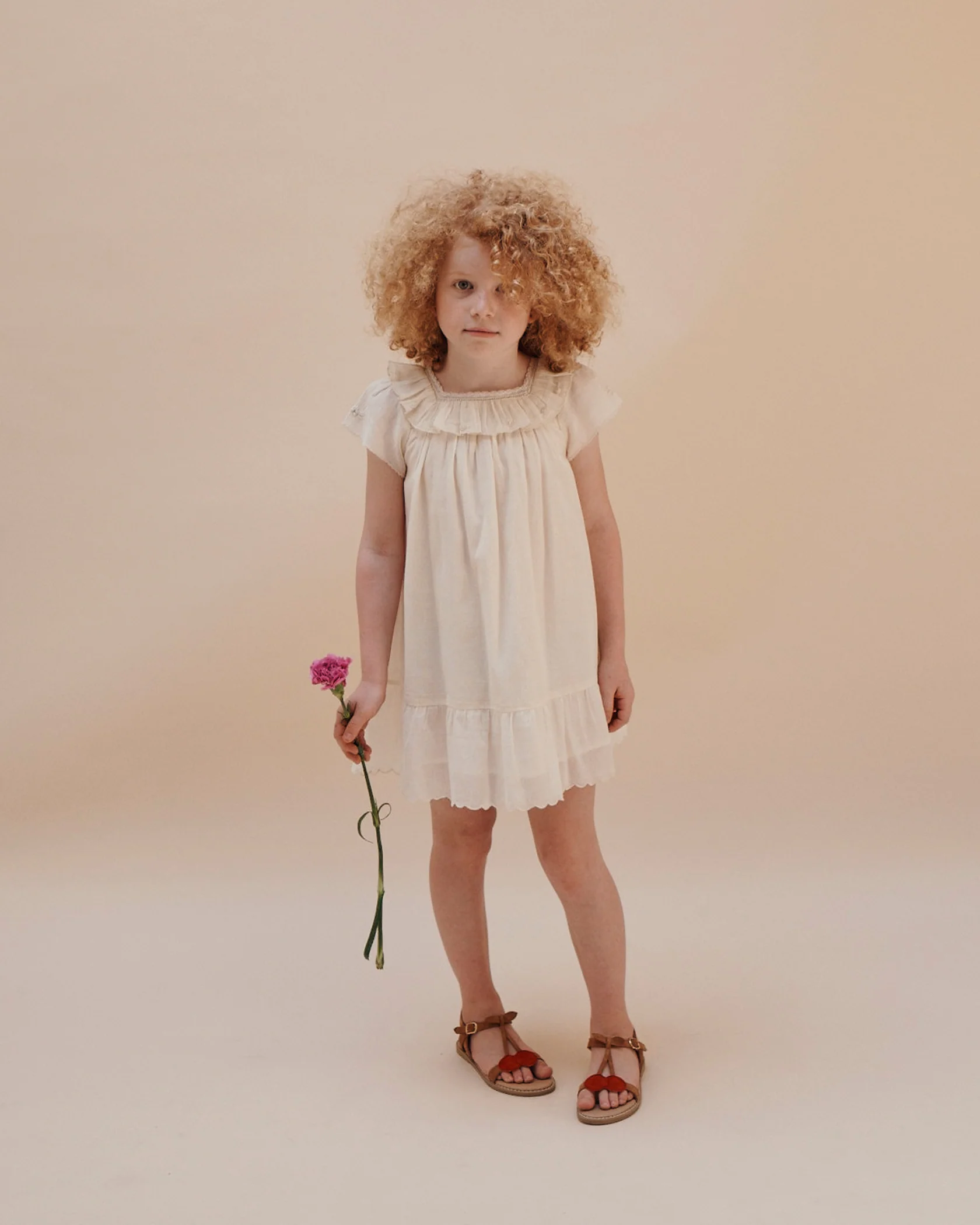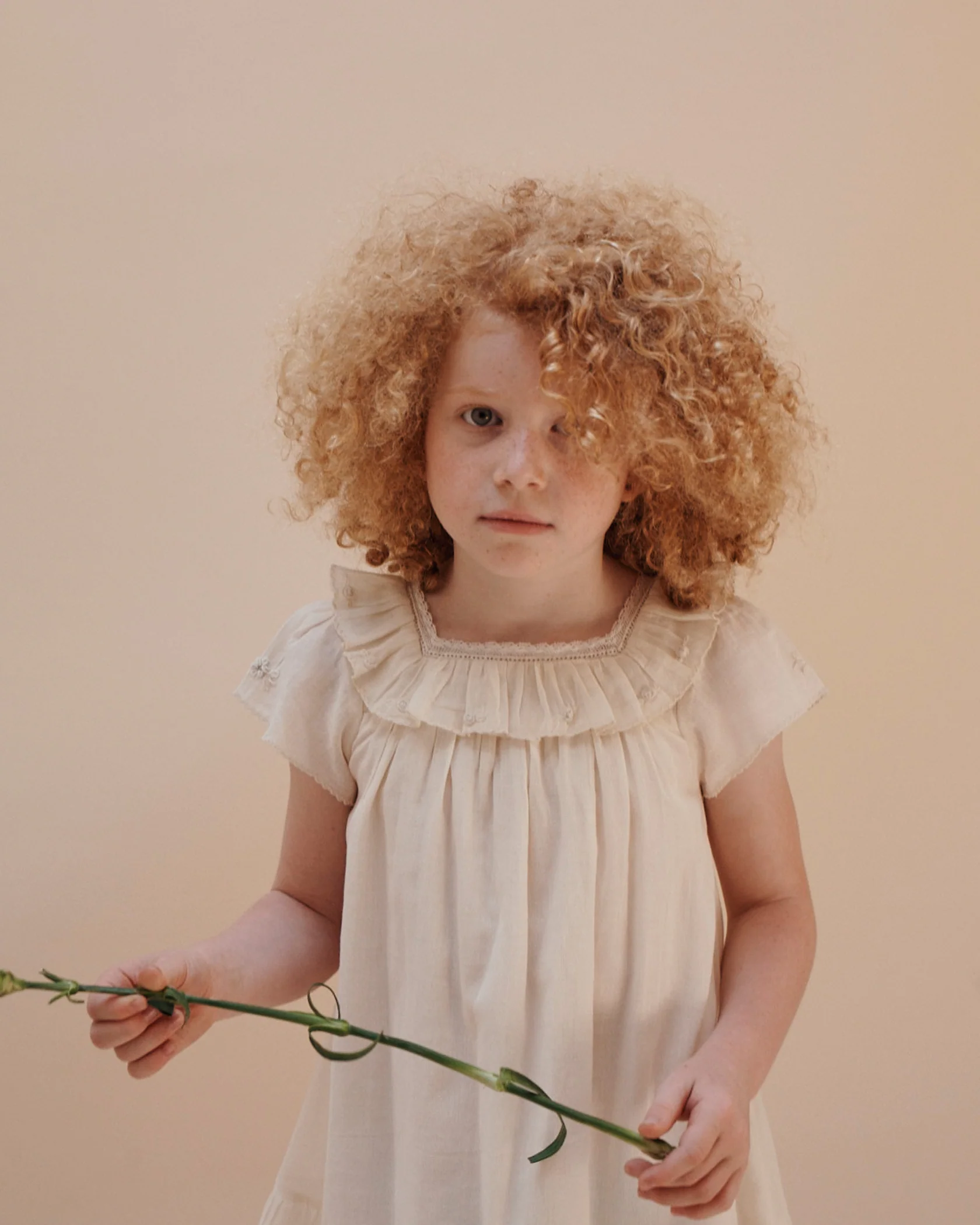 Robe en gaze de coton écrue, délicate et raffinée. Une touche de dentelle fine encadre l’encolure carrée, avec un délicat jour échelle. La collerette autour du cou et le volant au bas de la robe ajoutent une élégance supplémentaire. Les manches et le col sont ornés de fleurs brodées à la main, tandis que des ourlets festonnés au point de bourdon apportent une finition soignée. Entièrement doublée pour contrer la transparence de la matière, cette robe légère et aérienne sera parfaite pour toutes les occasions, des plus petites aux plus grandes.