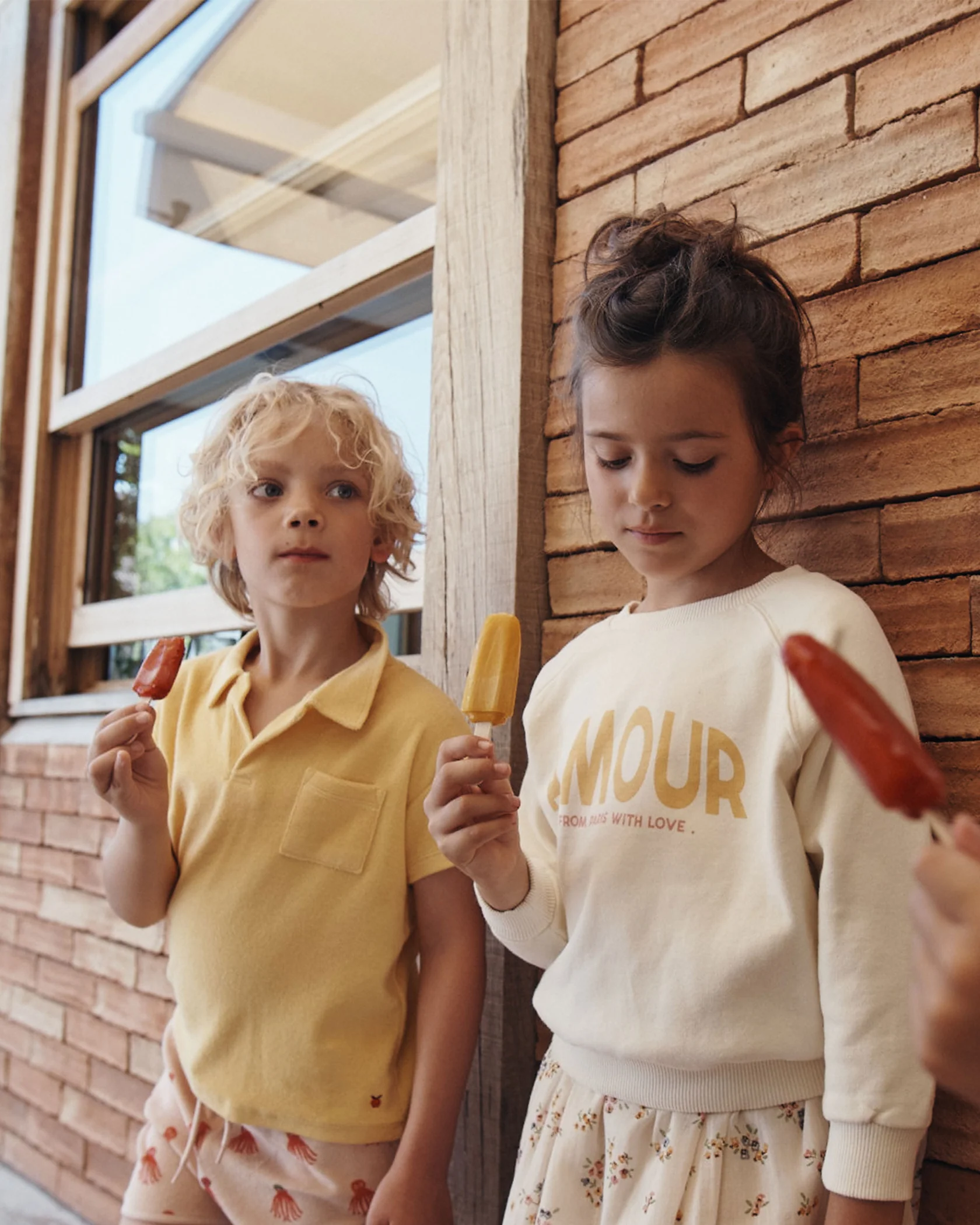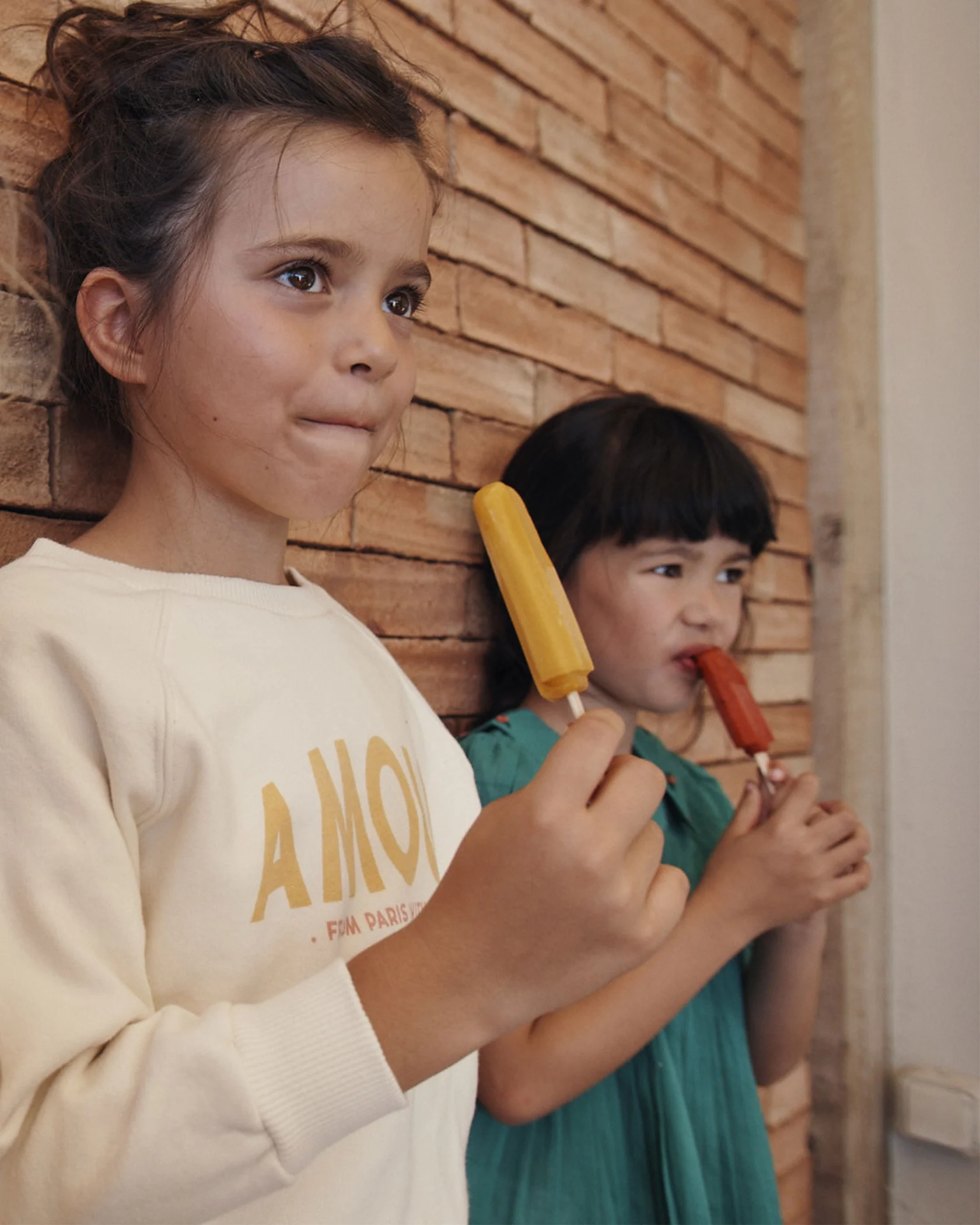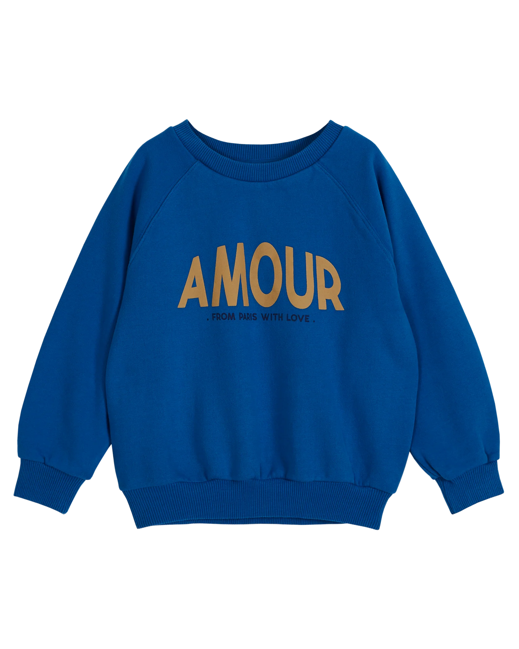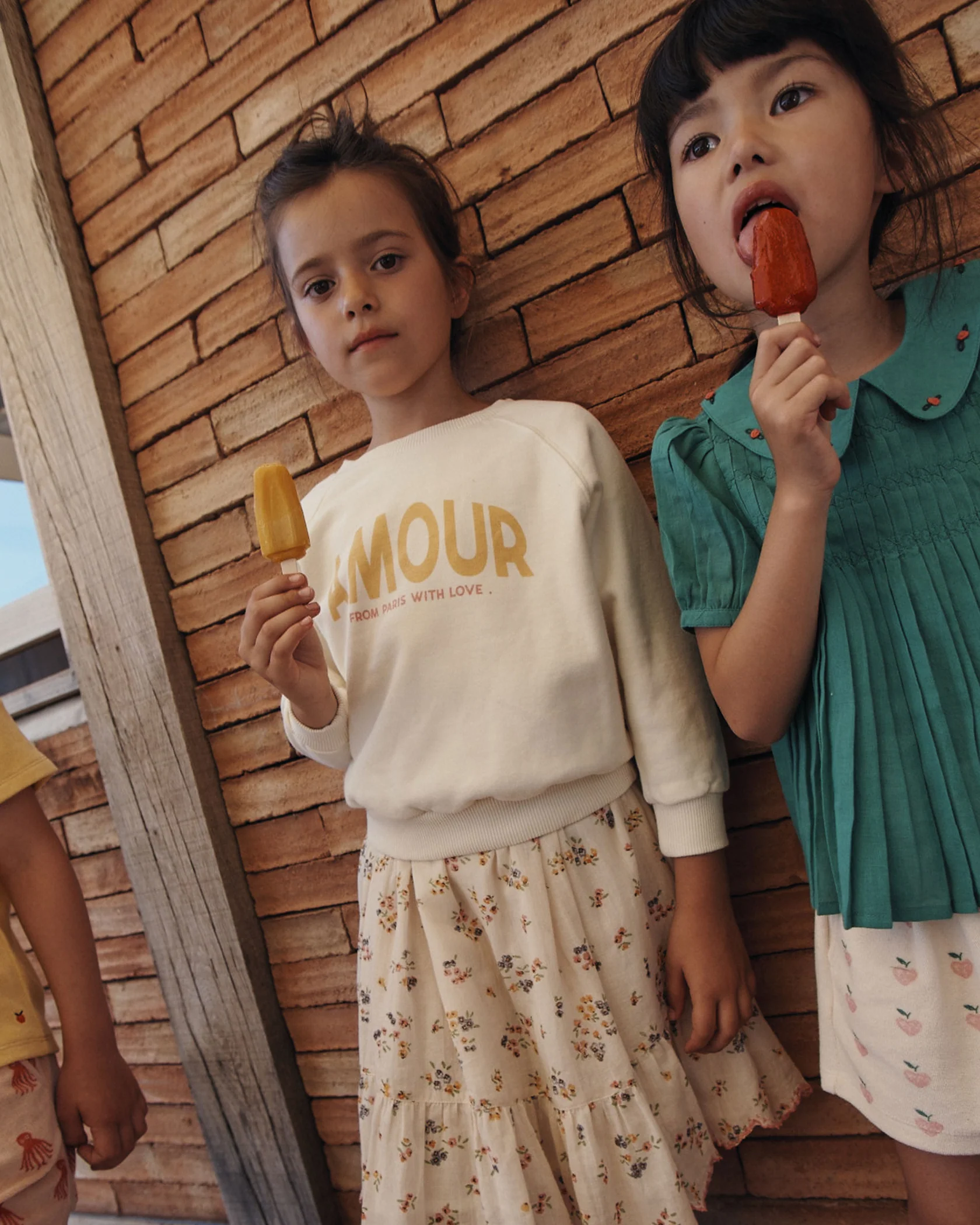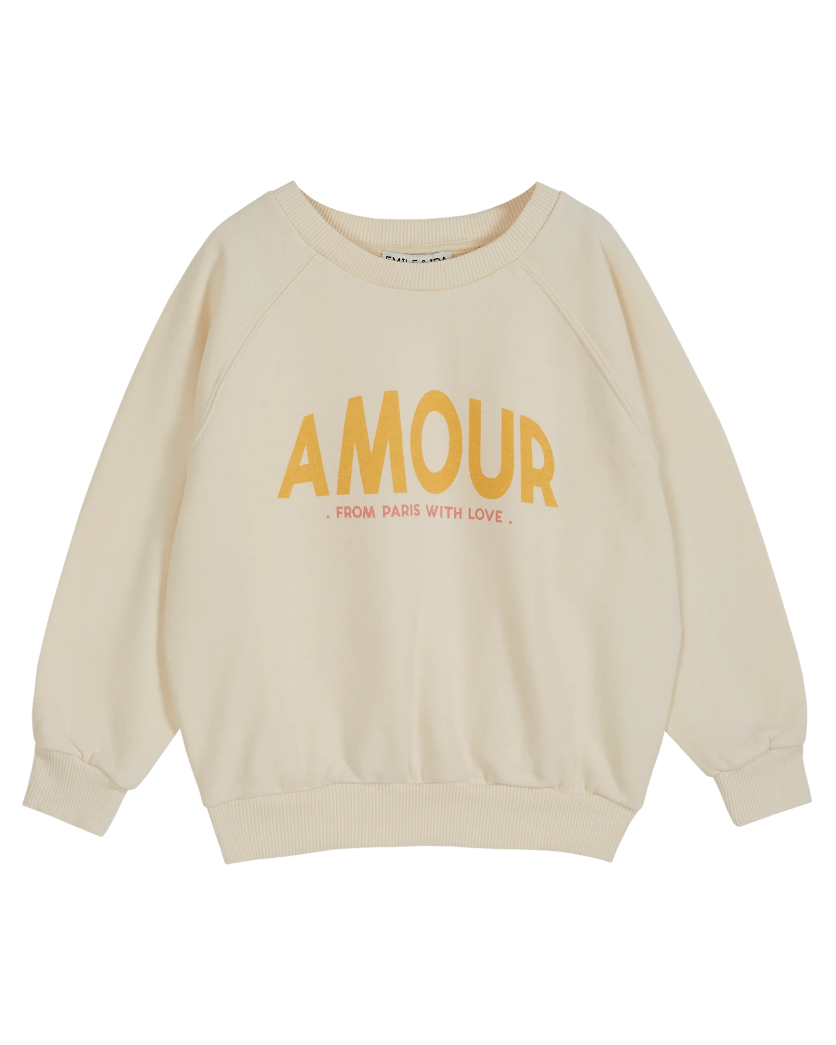 Sweatshirt en jersey de coton biologique écru. Ce sweat présente les caractéristiques habituelles de nos sweats : des manches longues raglan, une encolure ronde, des bord-côtes aux poignets, autour de l’encolure et à la base, ainsi qu’une matière douce. Mais ce qui le distingue, c’est l’imprimé AMOUR, from Paris with love, à l’avant et sous l’encolure du dos. Paris, la capitale de l’amour, célèbre pour le Baiser de l’Hôtel de Ville de Doisneau, le pont des Arts et ses cadenas, les chansons d’amour d’Édith Piaf, et même Quasimodo et Esméralda… À Paris, l’amour est omniprésent dans les rues !