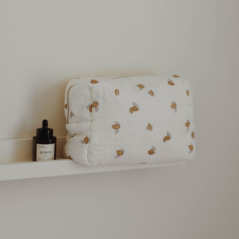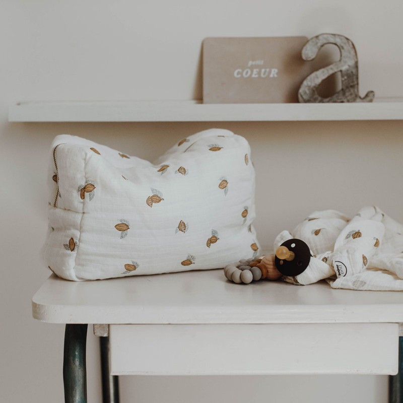 Confectionnée en 100% gaze de coton biologique certifié GOTS, elle est rembourrée en polyester recyclé : un matière légère et résistante, lavable en machine et facile d’entretien.